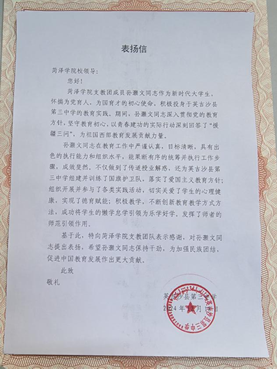 这份表扬信,不仅是对孙灏文同学实习支教工作的认可,更是对best365官网教学工作的肯定。它必将激励更多的同学以孙灏文为榜样,胸怀家国,肩负起时代赋予的使命与责任,到祖国最需要的地方去建功立业,让青春在奉献中绽放绚丽之花。