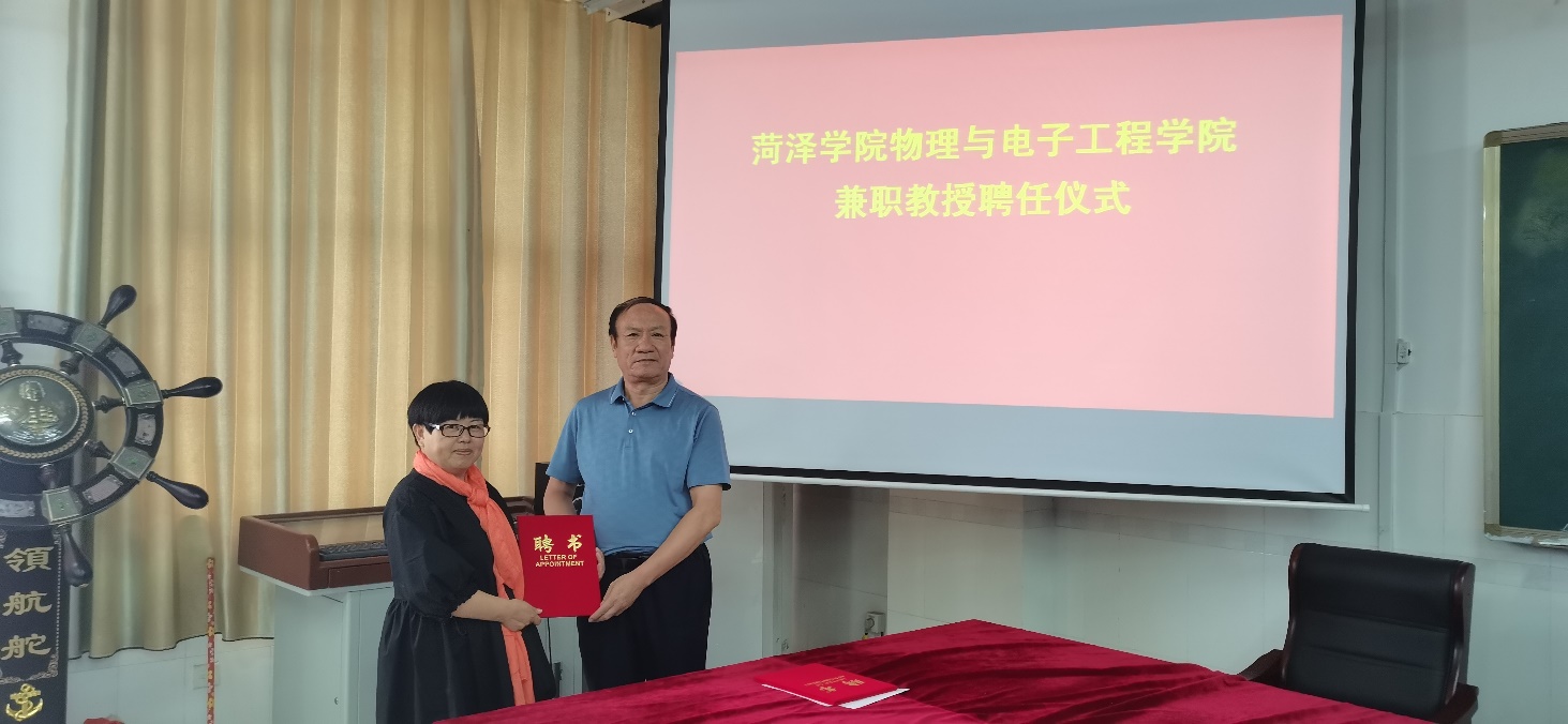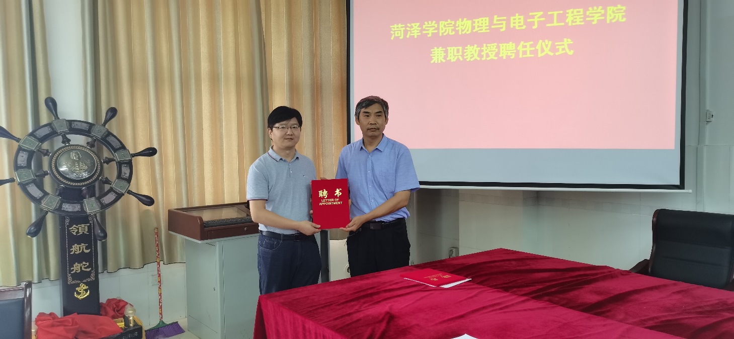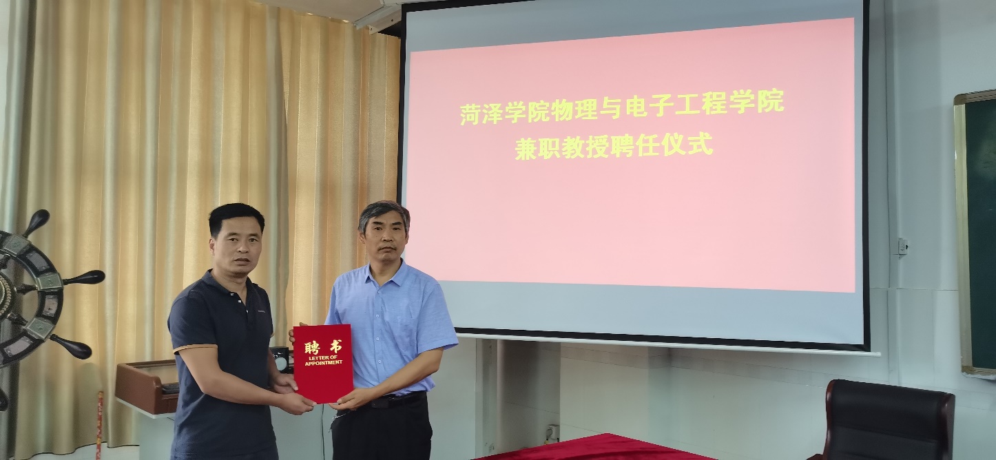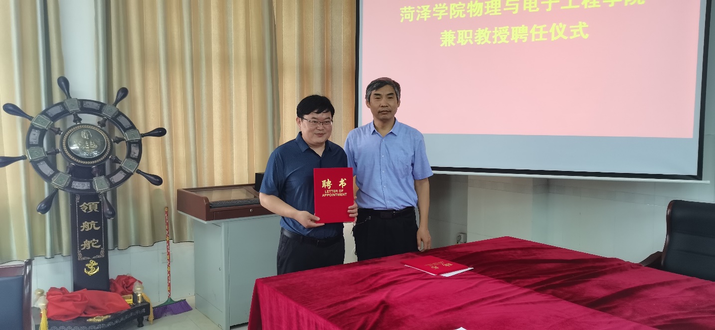 会后,徐兴磊院长和蒋继建副院长分别向曲阜师范大学刘广强教授、中国科院合肥物质研究院王永亮教授、淮阴工学院王延宗教授、曹县一中高级教师刘仰杰、东明一中高级教师李运霞、巨野实验中学高级教师刘海生、山东明灿光电科技有限公司总经理周开峰颁发了特聘教授证书。