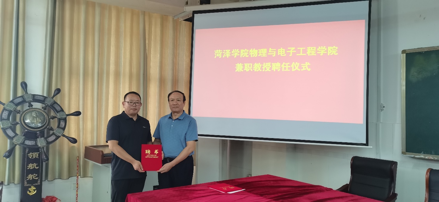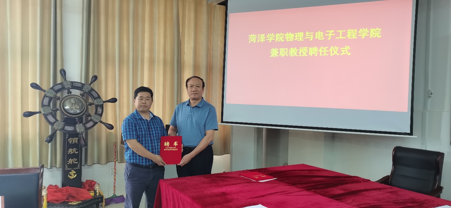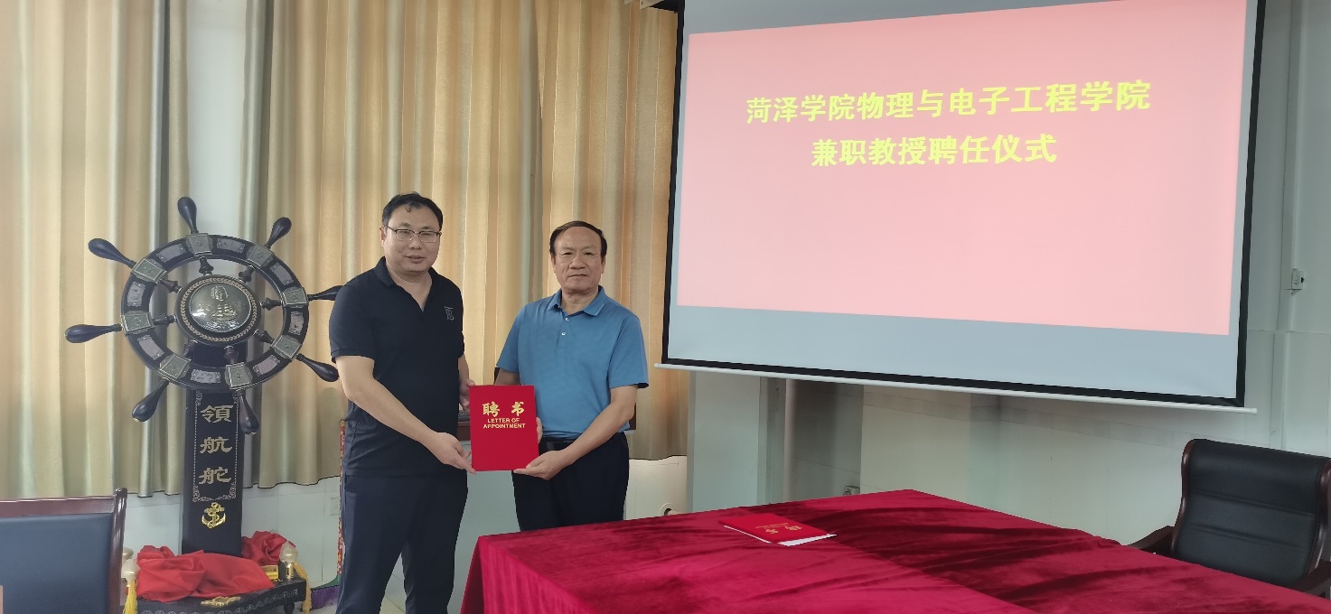 会后,徐兴磊院长和蒋继建副院长分别向曲阜师范大学刘广强教授、中国科院合肥物质研究院王永亮教授、淮阴工学院王延宗教授、曹县一中高级教师刘仰杰、东明一中高级教师李运霞、巨野实验中学高级教师刘海生、山东明灿光电科技有限公司总经理周开峰颁发了特聘教授证书。
