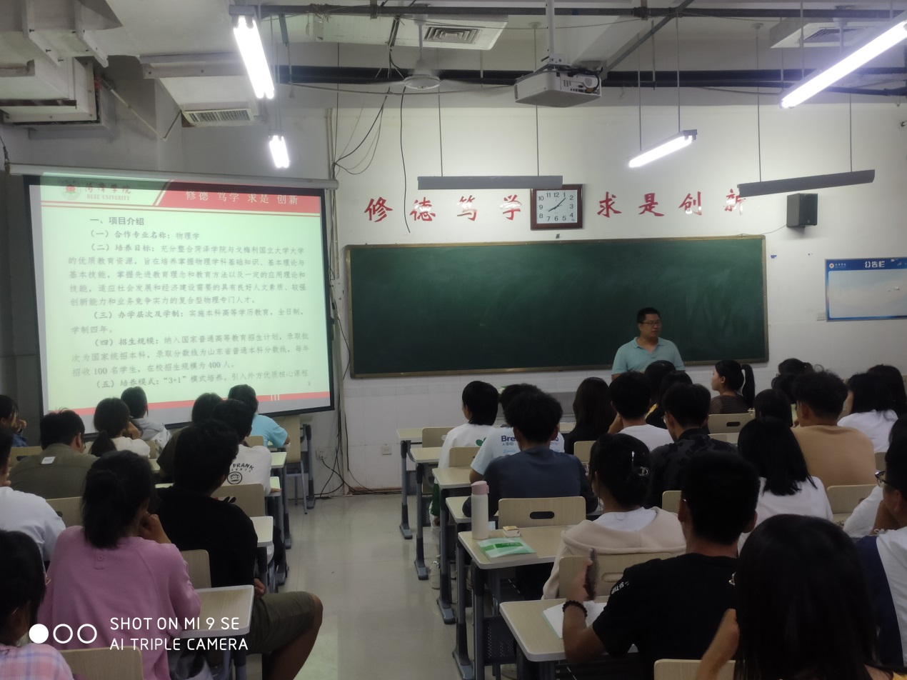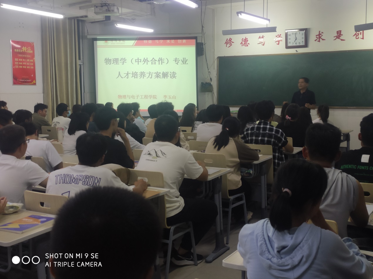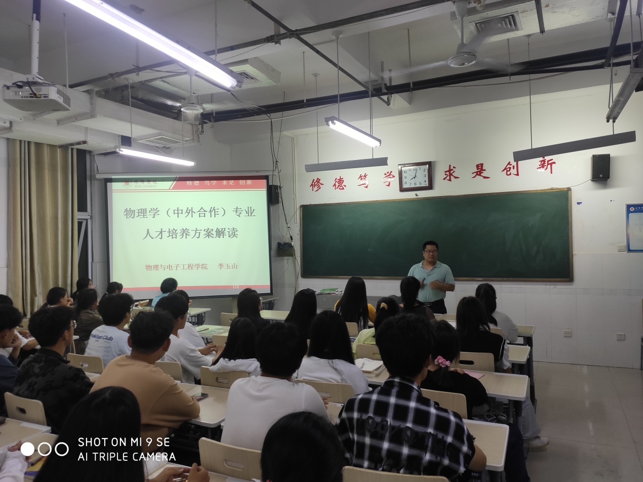 为让2022级物理学(中外合作)专业新生更好的了解物理学专业人才培养方案,best365手机版官方网站于9月22日在综合实验楼W502召开物理学专业人才培养方案解读培训会。国际交流与合作处张自海科长应邀出席培训会,培训会由物理系主任李玉山主持,2022级物理学专业93名新生参加此次培训会。