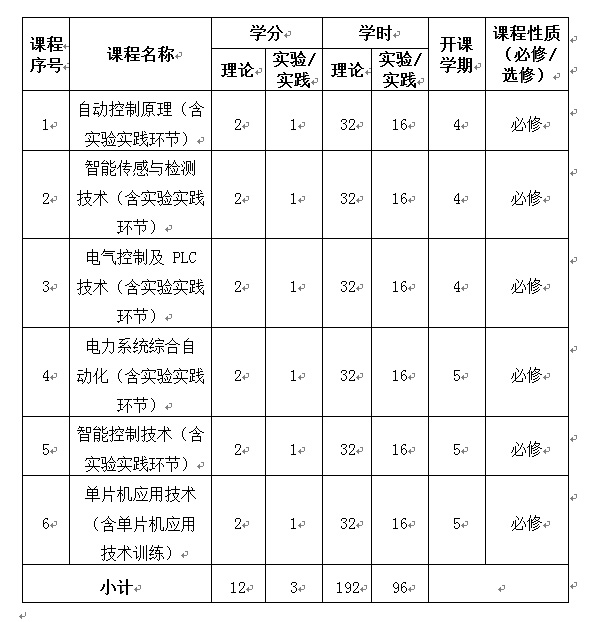 2.专业核心课程:包括电气控制及 PLC 技术、电力系统综合自动化、智能传感与检测技术、单片机应用技术等课程,通过这些课程,学生可深入学习电气工程领域的专业知识,了解智能控制技术在电气、电力系统中的应用,熟悉可编程逻辑控制器的原理和编程方法,熟悉常见的智能传感与检测技术、单片机技术,具备对电气、电力系统进行智能化控制的能力。