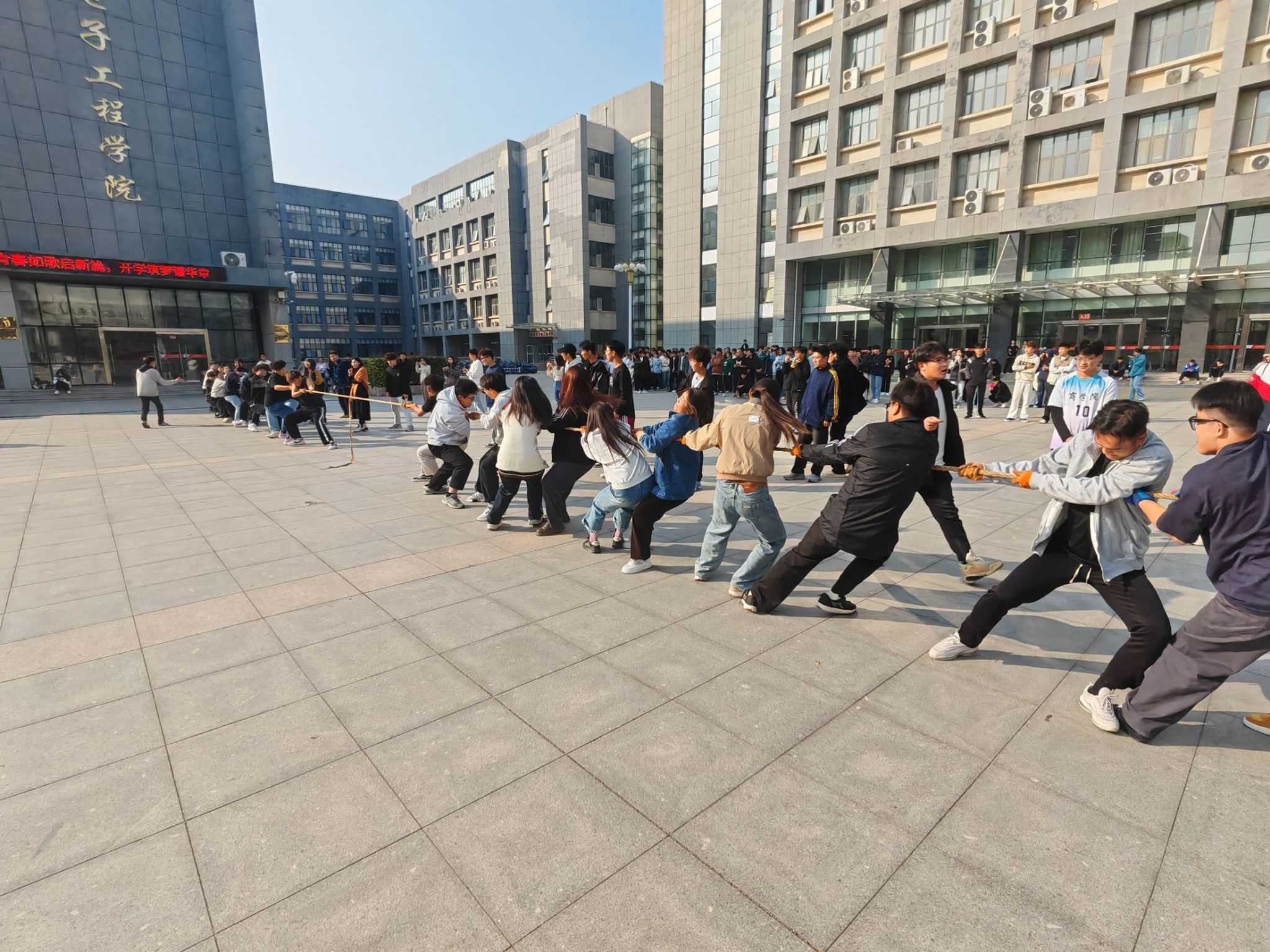 决赛在田径场进行,随着裁判的一声哨响,拔河比赛正式拉开了帷幕。刹那间,加油声、呐喊声、助威声此起彼伏,双方队员们迅速进入状态,他们紧紧地握住拔河绳,身体后倾,双脚用力蹬地,使出了浑身解数,每一次红布条的移动,都牵动着在场所有人的心。比赛进行得如火如荼,同学们用汗水诠释着团结的力量,用热情点燃了赛场的氛围。