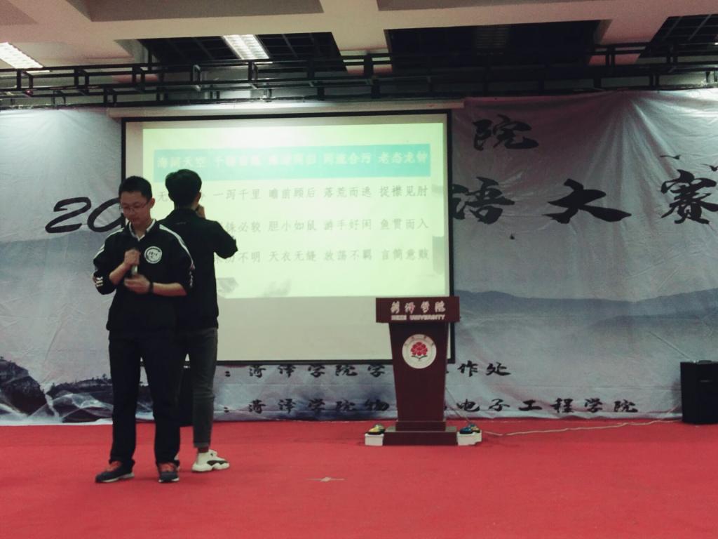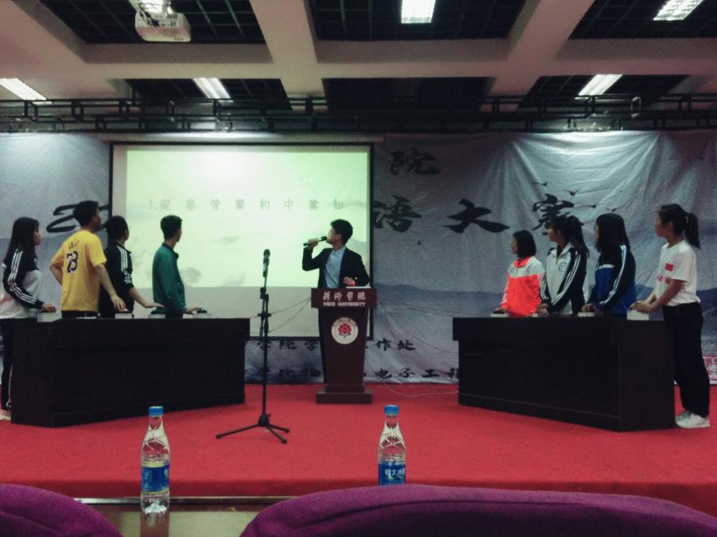 在比赛过程中,各院的选手们沉着冷静,认真思考,凭借着团队之间高超的默契和良好的现场应变能力,赢得了现场与在座观众的阵阵掌声。在两人配合猜成语的过程中,各学院选手们机智与想象共存,凭借丰富的成语累积将此环节的题目逐个击破,比赛过程精彩纷呈,展现出一场超凡精妙的成语盛宴。八点五十分,初赛圆满结束,人文与新闻传播学院、best365手机版官方网站、教师教育学院等八个学院晋级接下来的成语大会决赛。