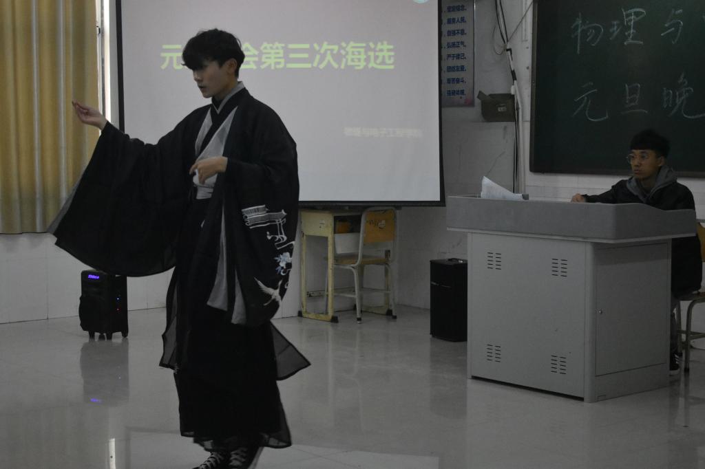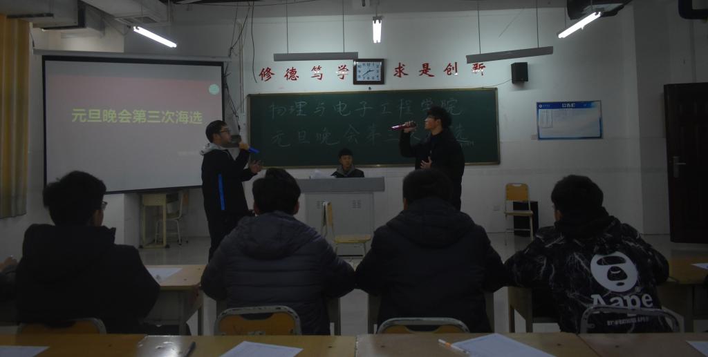 下午2:30,海选正式开始。首先开始的节目是饱含深情的演唱,有温暖的《等我回家》,令人震撼的《飘向北方》,温婉动听的《青花瓷》以及燃爆全场的《易燃易爆炸》。随后,同学们一支优美的舞蹈《牵丝戏》与《舞蹈混剪》,让人赏心悦目。最后,伴随着清澈悦耳的吉他指弹《summer》以及《病变》,元旦晚会海选落下帷幕。参加海选的同学满怀信心、认真表演;参与评审的同学一丝不苟、恪尽职守,敏锐地捕捉参加海选的同学的不足,现场气氛庄重而热烈。