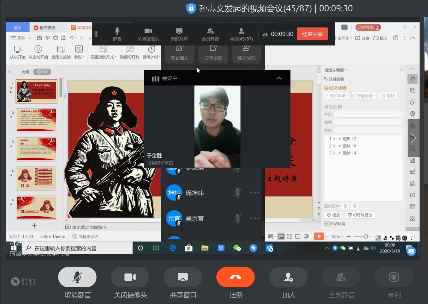 活动中,主持人通过PPT播放的形式详细介绍了雷锋同志的生平事迹,并对best365官网学生在疫情期间踊跃捐款,积极作志愿者的行为表示十分敬佩,这正体现着我物电学子们的雷锋精神。部分同学也通过连麦的方式向大家分享了自己对雷锋精神的理解与认识。