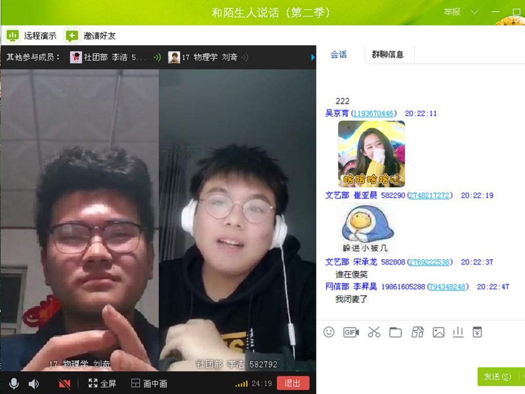 best365手机版官方网站特色活动《和陌生人说话》第二季第一期于2月19日晚8:00以QQ群直播的方式进行线上开展。本期活动邀请到了best365手机版官方网站学工办主任任雪莲老师,辅导员张明华、吴京育、贾晓蒙老师以及学生会部分主席团成员、部长参加。