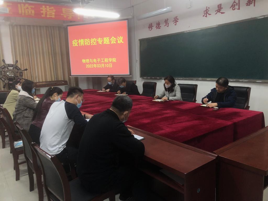 3月10日下午,在综合实验楼W207会议室,物理与电子工程学院召开疫情防控工作会议。党委书记刘燕、院长徐兴磊、副书记杨宏宇、副院长蒋继建、党政办公室主任贾建运及全体辅导员参加此次会议。