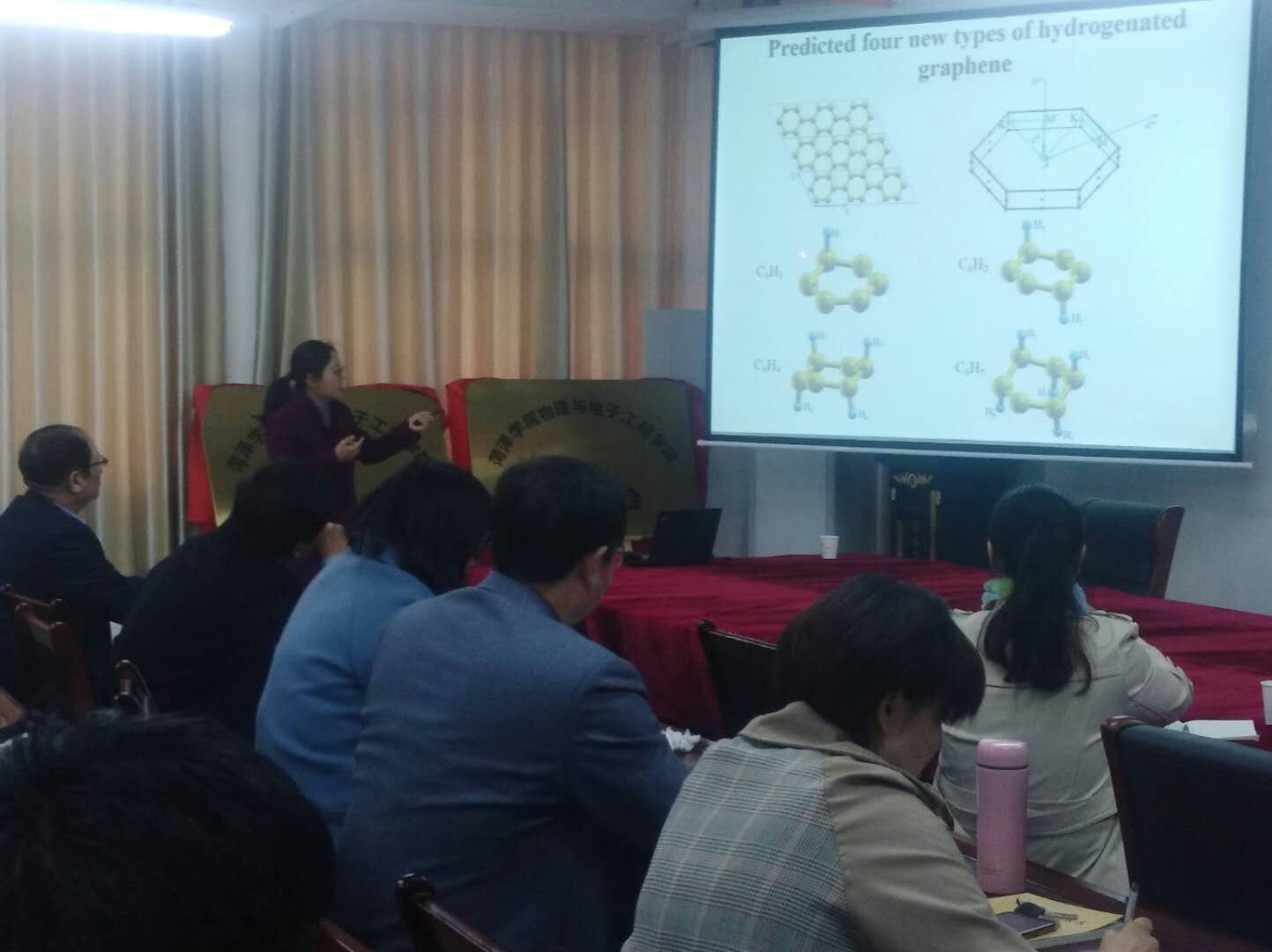 对石墨烯的电子结构进行调控,进而实现特殊的物理性质和功能,成为当今物理、化学、材料等领域的研究热点。路洪艳教授的报告针对氢化石墨烯电子结构的有效调控等问题展开,她从理论上预言了几种周期性氢化石墨烯,并发现了不同于石墨烯的新奇物理性质,其中有的体系被后来的实验组制备成功。路教授结合自身科研实际,用深入浅出的语言带领我们走进了氢化石墨烯的研究世界,给我们做了一场精彩的学术报告。报告结束后,路洪艳教授与考研学生进行了热烈、深入地交流互动,鼓励大家积极报考研究生。
