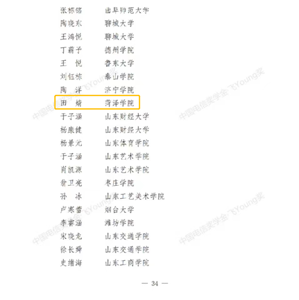 近日,由共青团中央、全国学联指导,中国电信集团有限公司、中国光华科技基金会联合举办的2021年度“中国电信奖学金”推报活动结果揭晓。经学生申请、学院审核、学校推荐、省级初评、全国评审等环节,我校best365手机版官方网站学生田婧获评“中国电信奖学金·飞Young奖”。