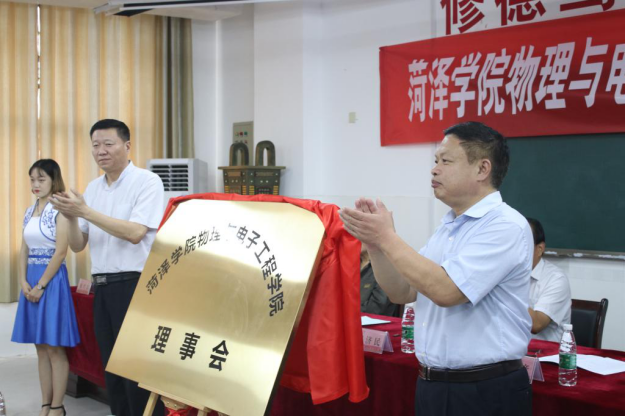 周广彦副院长和菏泽市委统战部副部长、市工商联党组书记靳海岩为理事会、师生发展联谊会揭牌