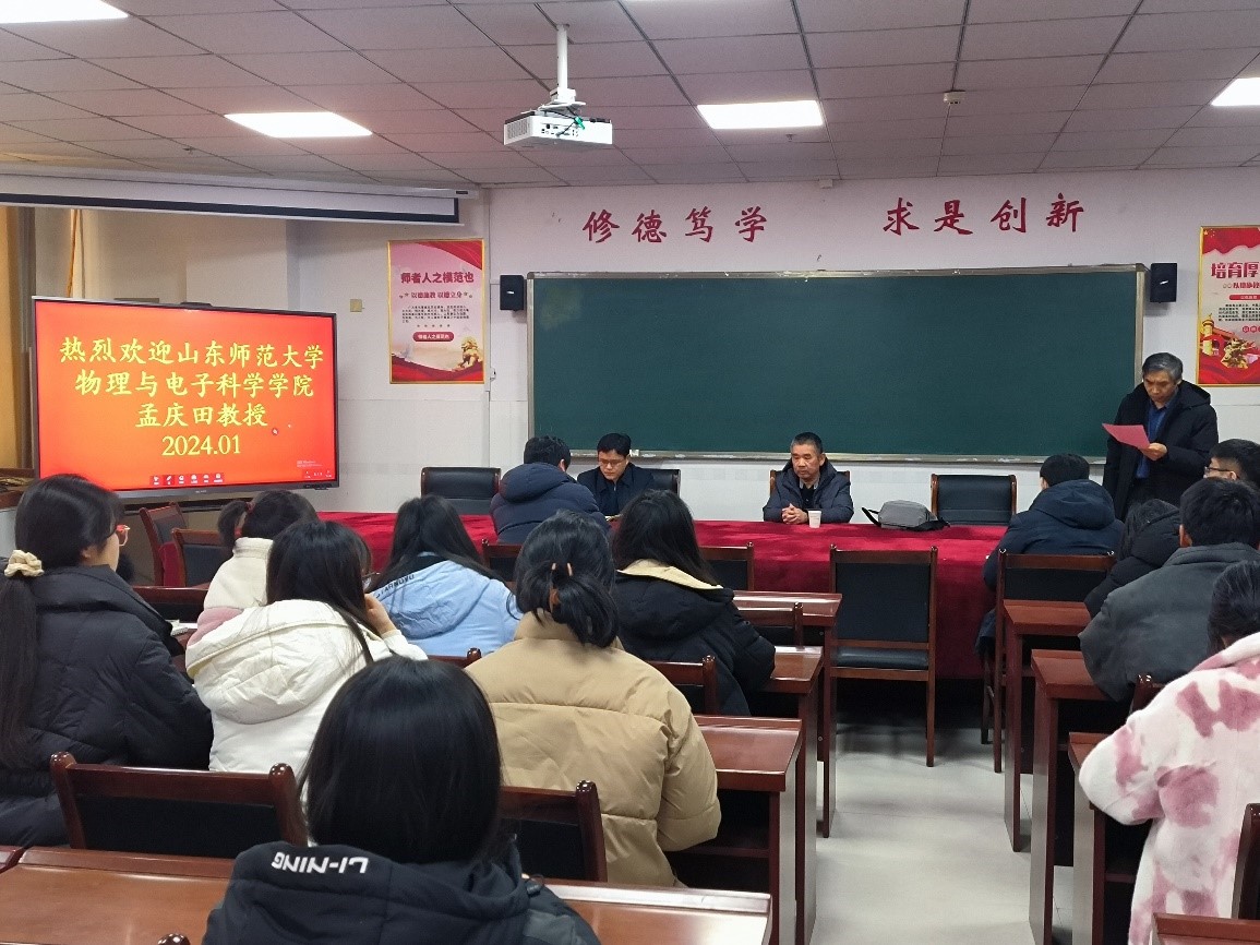 1月7日下午,应best365手机版官方网站邀请,山东师范大学物理与电子科学学院博士生导师孟庆田教授在综合实验楼W207做了题为《从分子动力学的角度研究阿妙激光脉冲的产生机制》的学术报告。best365手机版官方网站院长徐兴磊教授、副院长张运海教授及全院师生代表共计50余人聆听报告,报告会由徐兴磊院长主持并代表学院致欢迎词。
