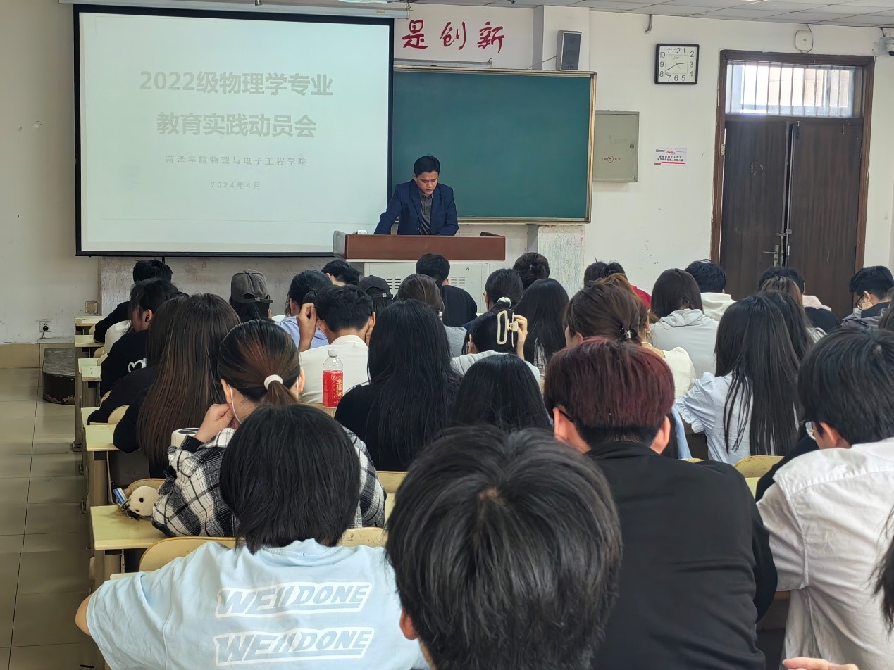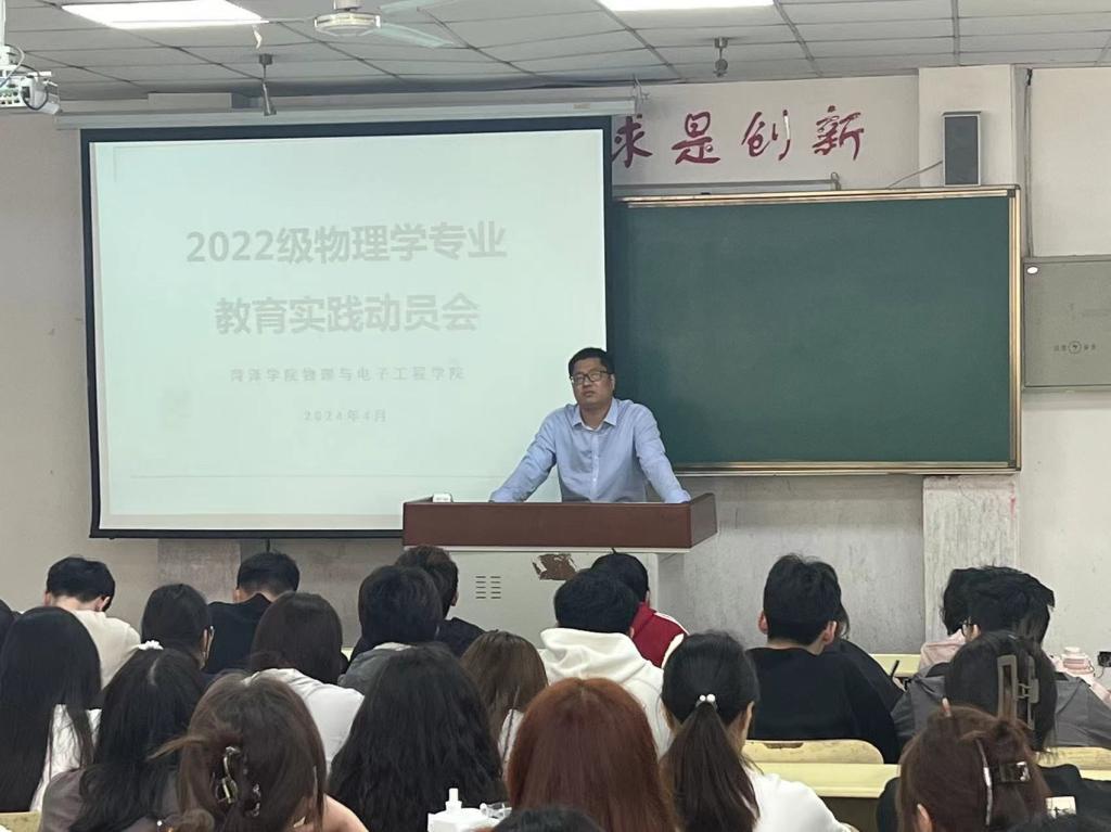 张运海院长对2022级物理学专业的教育实践工作进行了动员讲话。他指出,师范生教育实践是教师教育课程的重要组成部分,是教师培养的必要环节。同学们要以“一践行三学会”为目标,认真开展“师德体验、教学实践、班主任管理实践和教研实践”四维覆盖的实践教学活动,实现教育认同力、职业胜任力、核心竞争力、专业发展力的整体提升。他要求同学们在教育实践过程中要增强安全意识,坚定理想信念、厚植爱国情怀、涵养师德师风、践行教育使命,不断提升为党育人、为国育才的能力和水平。