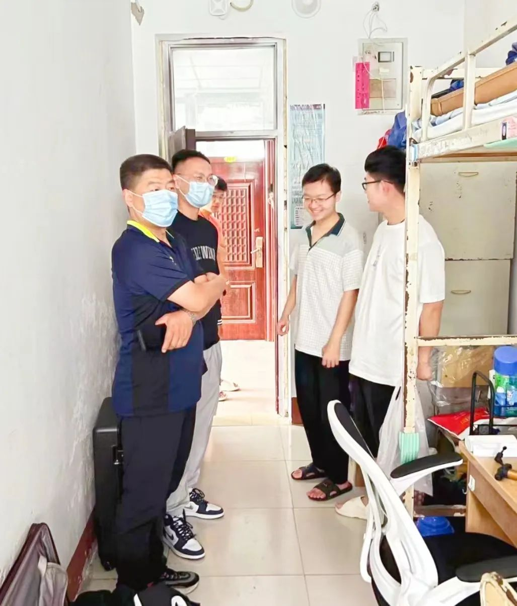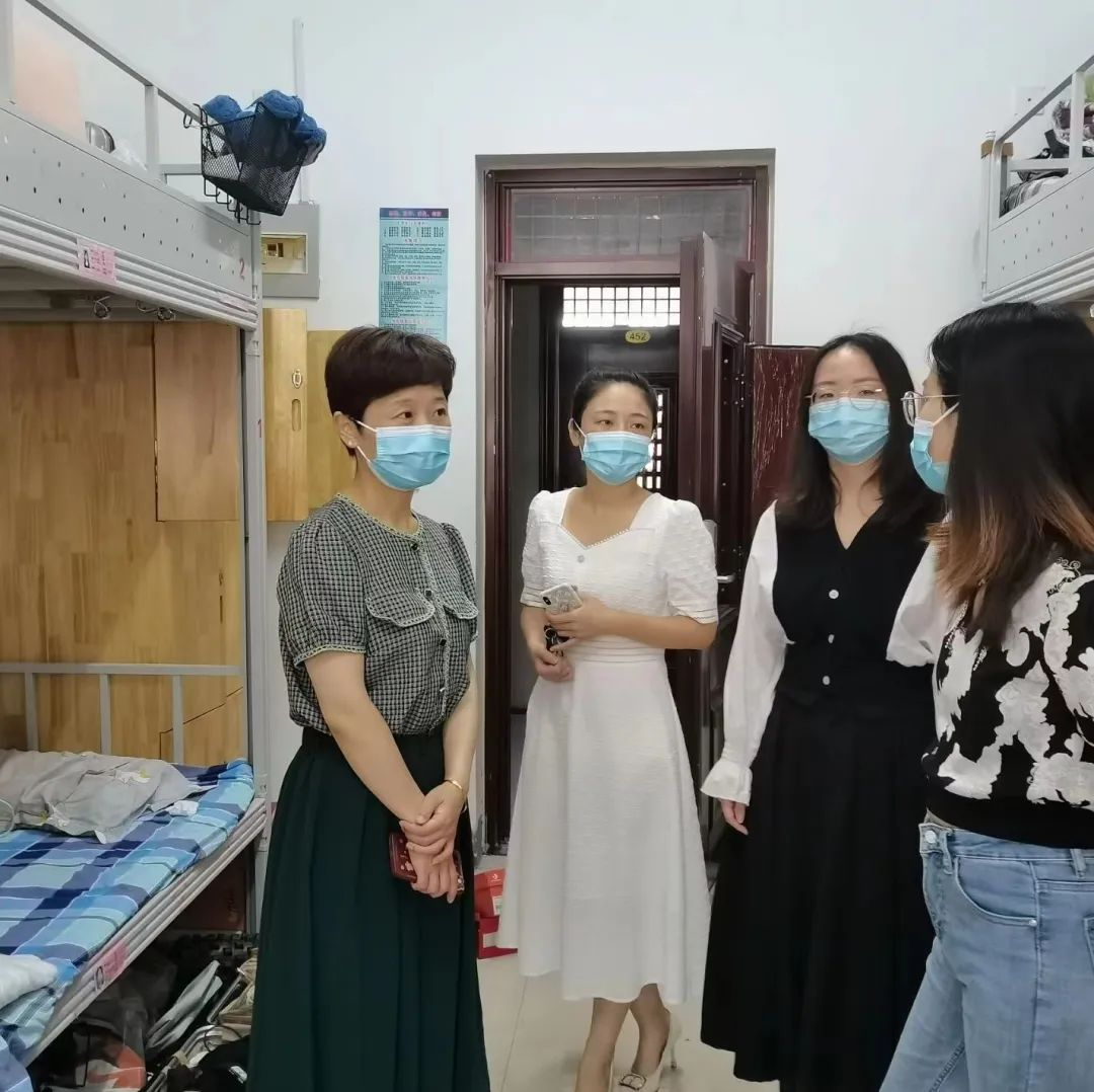 为贯彻落实学校疫情防控工作要求,深入了解学生返校后的生活情况和需求,排查宿舍安全隐患,2022年8月27日上午,best365手机版官方网站党委书记徐鹤同志、党委副书记祝清森同志以及辅导员老师吴京育、贾晓蒙、董双双、李晨等深入宿舍走访慰问返校学生。