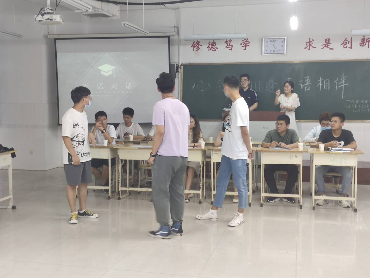晚7:00活动正式开始。学生自行组成三人小组,每组派出一人观看所给故事,并用手语及肢体语言进行表述,传递给下一人,第三人依据前者手语来叙述出故事内容。另外,每组派出两人观看所给成语,并用肢体语言进行表述,禁止出声,另一人说出相对应成语,每组有两分钟时间进行挑战。活动过程中,同学们努力表达,气氛紧张又欢快,活动在欢声笑语中结束。