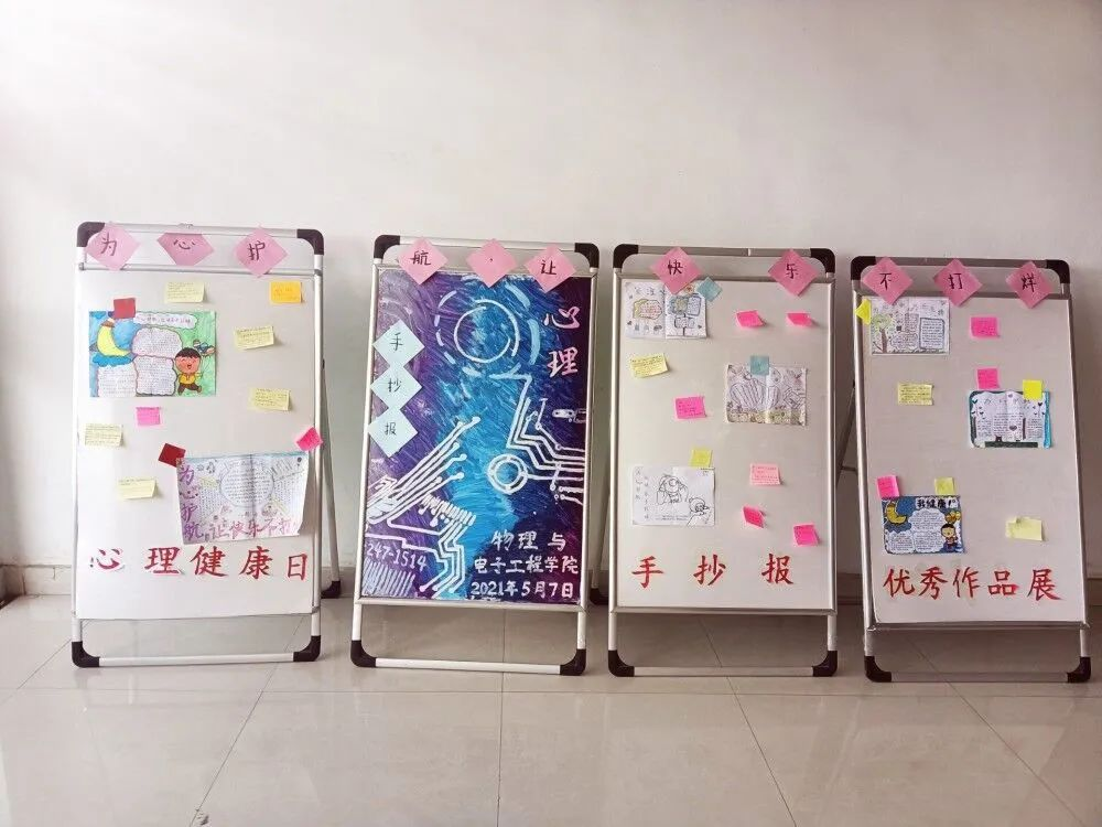 前期各班级心理健康委员在班级内进行宣传,调动学生参加的积极性。参赛学生在规定时间内完成并上交手抄报作品,并将作品在综合实验楼5楼西厅进行作品展示及现场投票,最终评选出获奖名单。