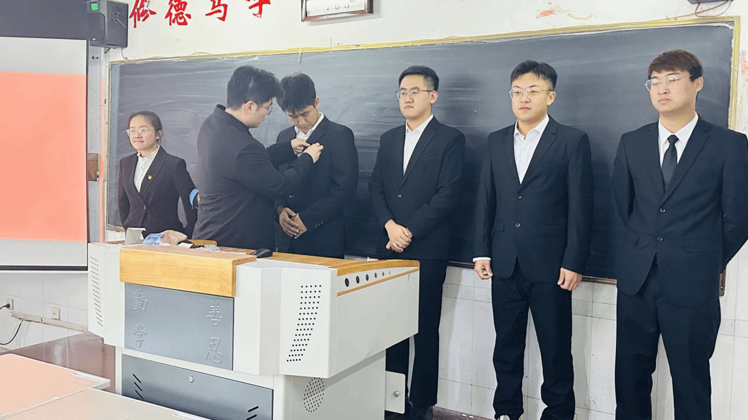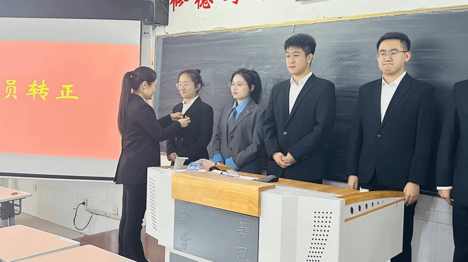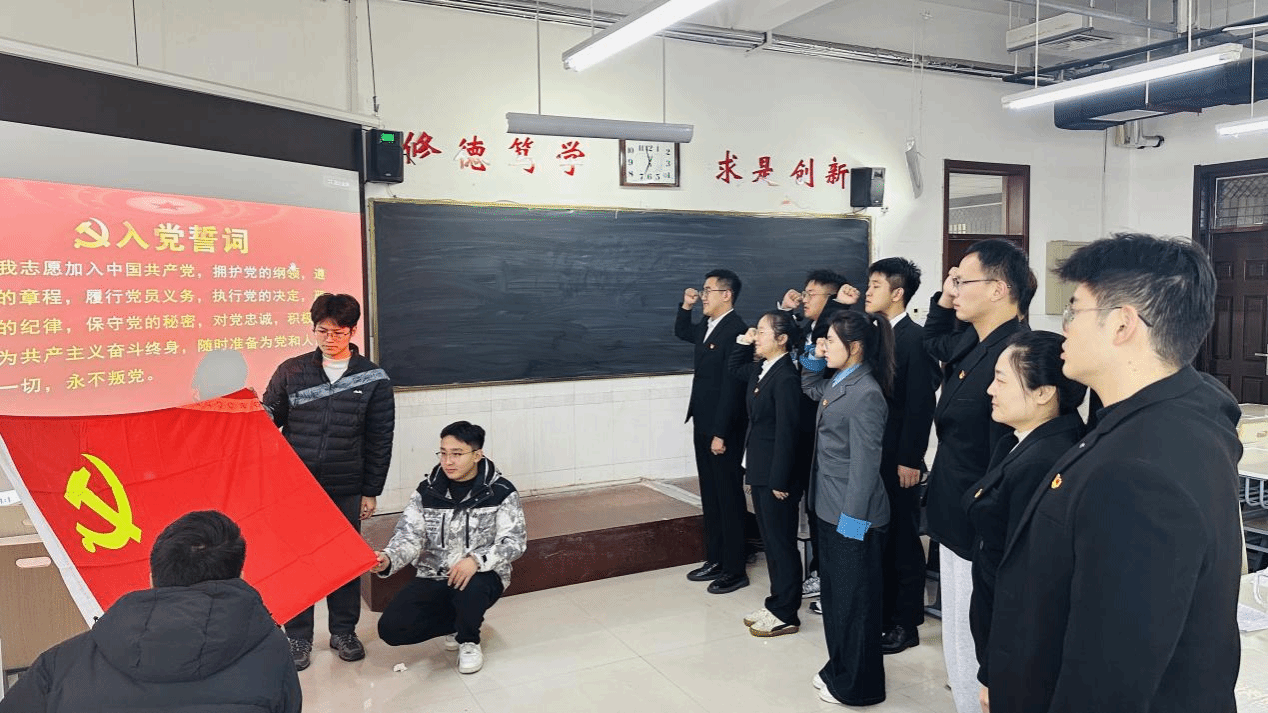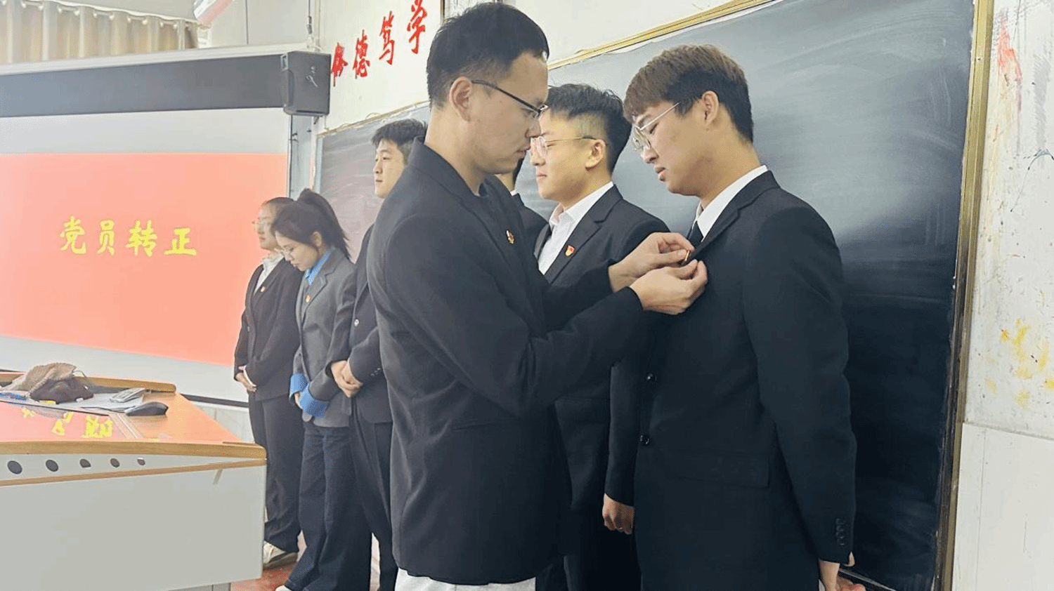 宣誓仪式在庄重肃穆的《国际歌》声中开启,董双双、李晨和厉剑为6位新发展预备党员佩戴党徽。那闪耀的党徽蕴含着崇高的入党使命,代表着无上的荣耀。他们深刻明白党徽不仅是身份的标识,还是责任与担当的承载。全体党员面向党旗,紧握右拳,庄严宣誓。铿锵有力的誓言响彻整个会场,彰显了共产党员为实现中华民族伟大复兴而不懈奋斗的坚定决心。