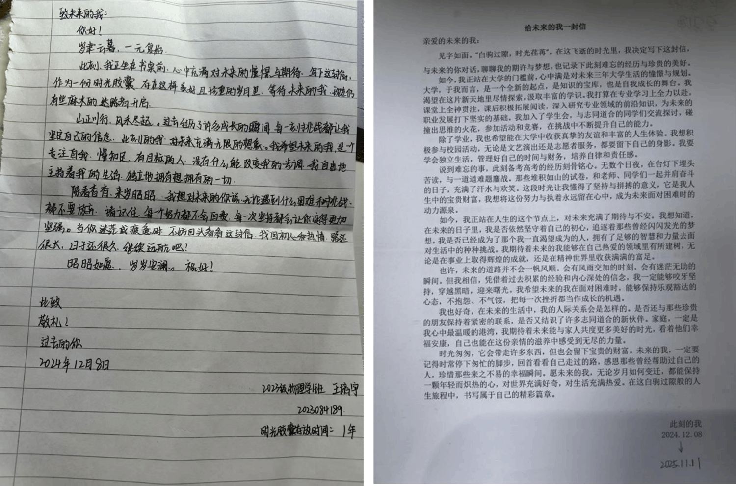 活动以“文墨韶华,胶囊诗笺”为主题,邀请同学们给未来的自己写下一封信。这些信件不仅是对个人成长历程的记录,也是对心理健康状态的一种自我反思和自我疗愈。通过参与此次活动,同学们不仅能够封存珍贵的记忆,还能在筹备、封存和约定开启时光胶囊的过程中增进彼此的情感联系,加深信任与亲密感,凝聚群体情感记忆,提升集体的心理健康意识。