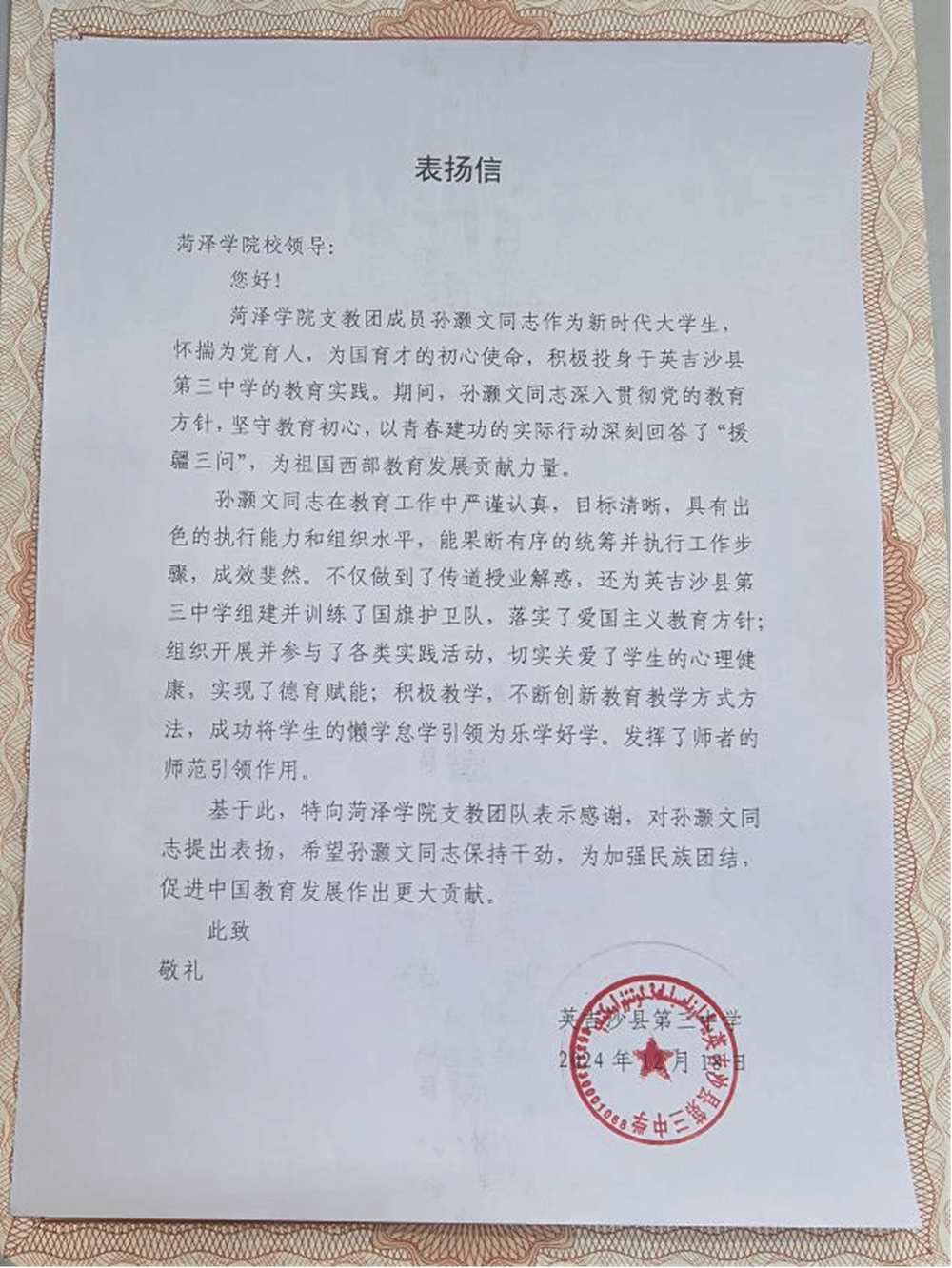 近日,best365官网收到了一封来自英吉沙第三中学的表扬信,信中对best365官网2022级物理学专业孙灏文同学在援疆实习支教期间的表现予以高度赞扬,字里行间满是对他奉献精神和专业素养的肯定,这不仅是孙灏文同学个人的荣誉,更是best365手机版官方网站的骄傲。