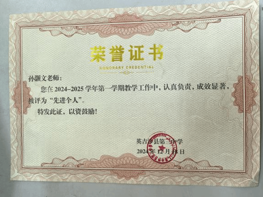 2024年9月,孙灏文同学积极响应国家号召,投身援疆实习支教,将自己的青春与热情播撒在新疆喀什地区的基础教育上。实习支教期间,他克服了地域、文化和生活习惯等诸多方面的困难,迅速适应新环境,全身心投入教学工作。