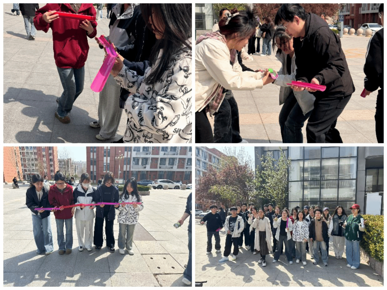 活动伊始,打沙包游戏瞬间将气氛点燃。同学们分成两队,在划定区域内展开对决。进攻方蓄势待发,用力掷出沙包;防守方身姿矫健,巧妙避开攻击。紧接着是考验团队默契的 U 型管传球游戏,同学们手持 U型管依次排列,首尾相连,小心翼翼地护送乒乓球前行。大家屏气凝神,专注调整角度,在一次次尝试中,团队成员沟通愈发顺畅,配合也愈发娴熟,凝聚力在无形中得以提升。