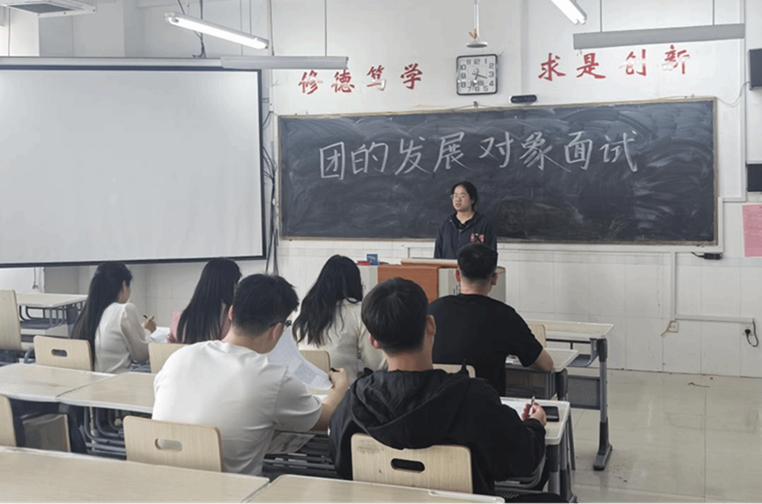 本次团员发展对象答辩工作分为自我陈述和提问答辩两个环节。在答辩过程中,同学们表达了自己迫切想要加入团组织的愿望,并阐述了自身的综合素质与实践能力。各位老师围绕思想政治素养、团的知识储备、语言表达能力、现场应变能力等维度,严格遵循“全方位考察、全过程把关”原则,依据每位入团积极分子的展示内容进行针对性的提问,对9名入团积极分子进行了综合评估。