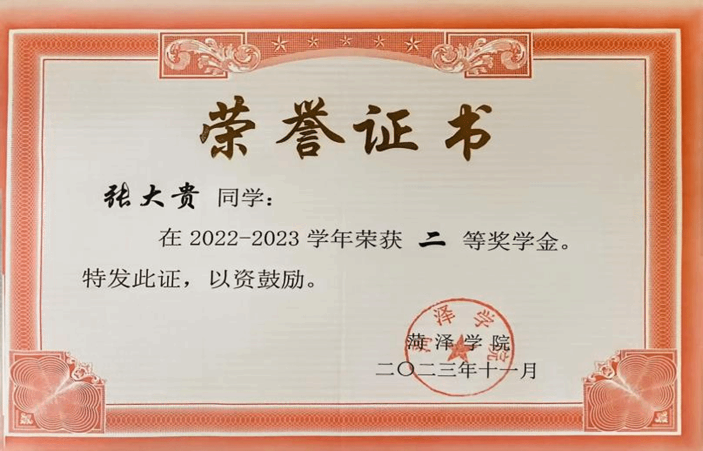 1. 2023年8月,获第十五届山东省大学生科技节——物理实验大赛一等奖;