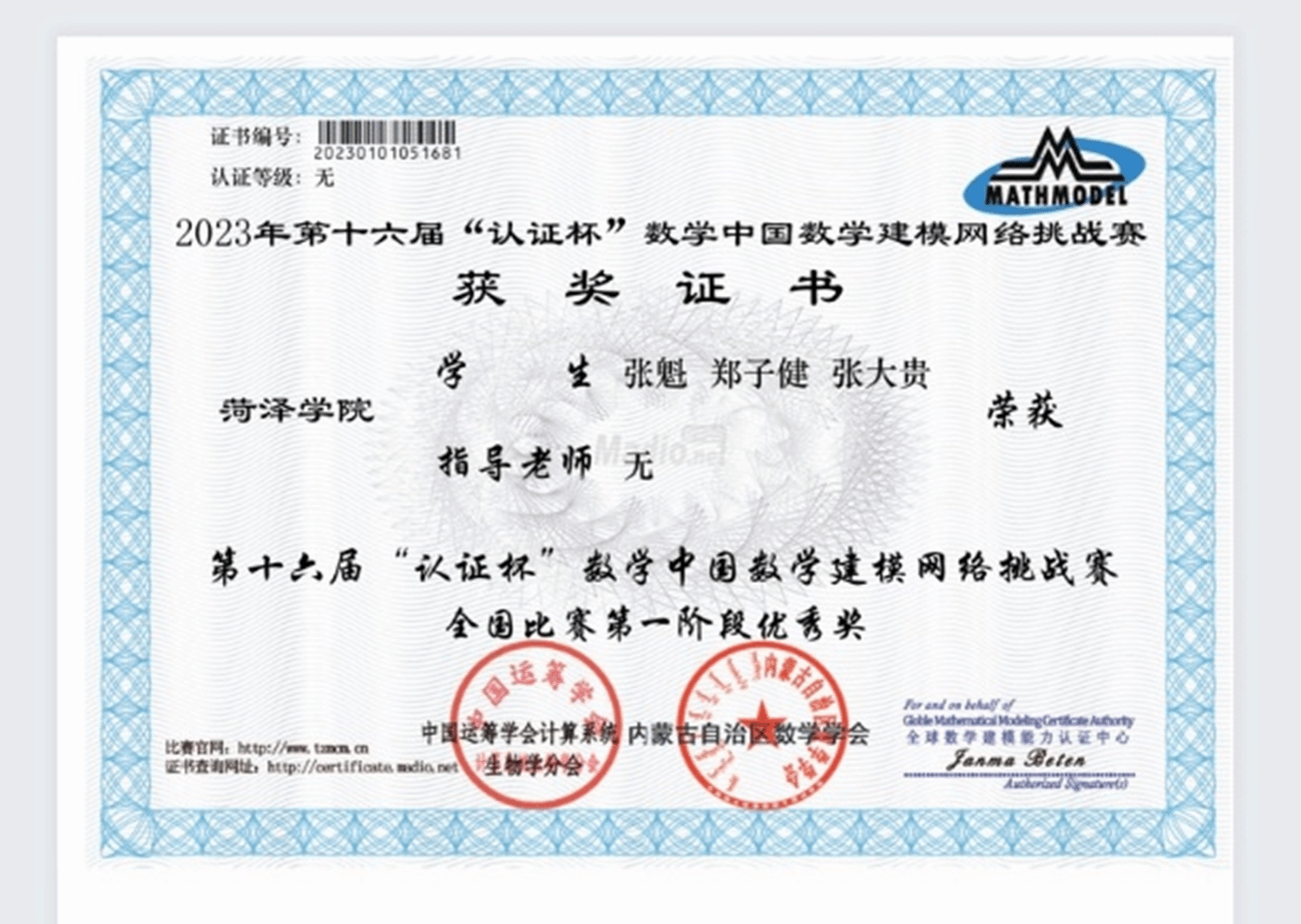 2.2023年10月,获第十六届“认证杯”数学建模网络挑战赛全国比赛第一阶段优秀奖;