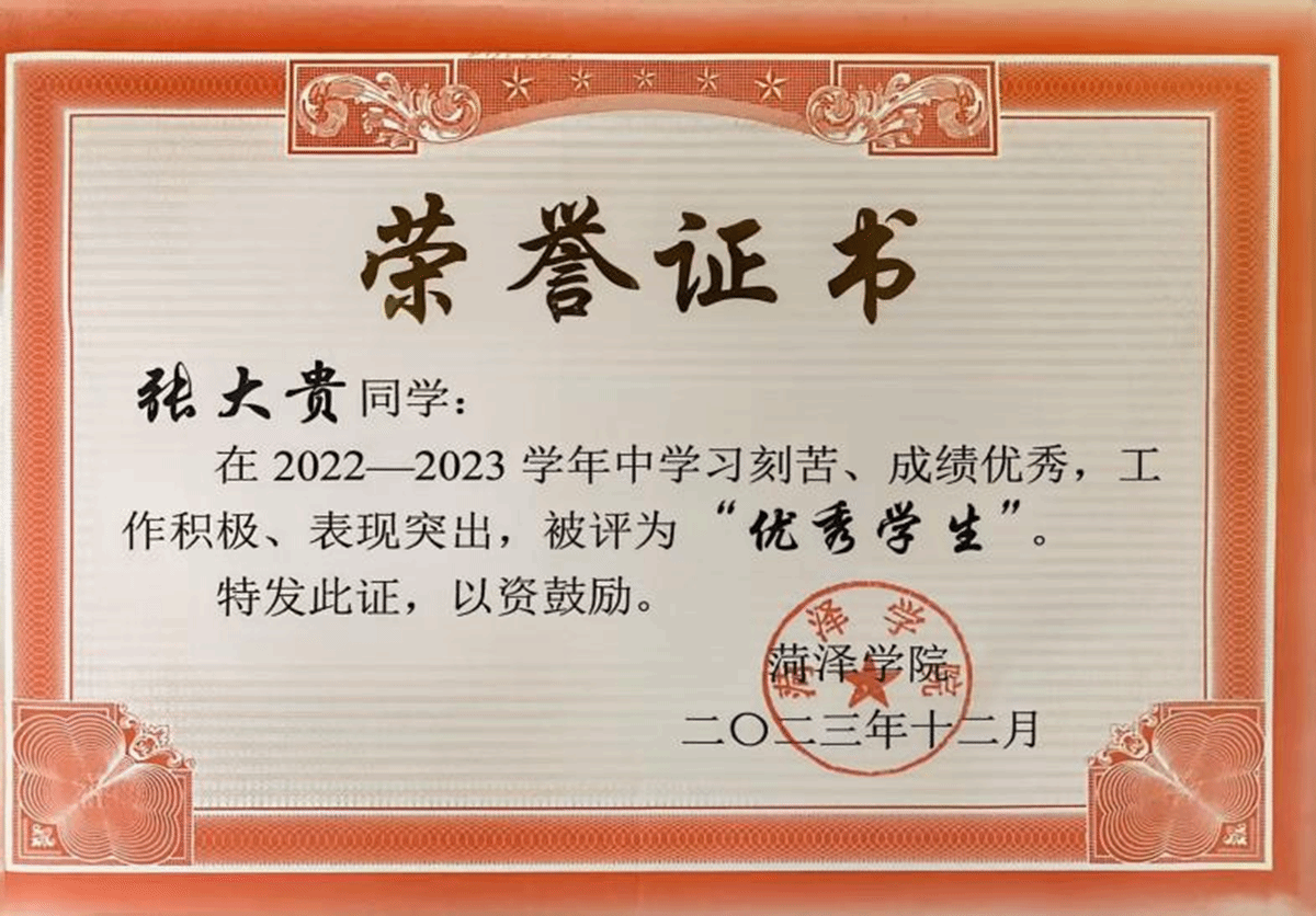 笃学不倦,勇攀学业高峰。在学业的征程上,张大贵勤奋刻苦、一丝不苟,始终秉持着对知识的强烈渴望和对学术的敬畏之心。课堂上,他是那个全神贯注听讲、积极回答问题并与老师积极互动的学生;课后,图书馆和自习室成为他的“第二战场”,他沉浸在书本的海洋里,努力钻研每一个知识点,不断拓宽自己的知识面。历经数载拼搏,终在2023-2024学年取得学习成绩班级第一,年级第三的优异成绩。