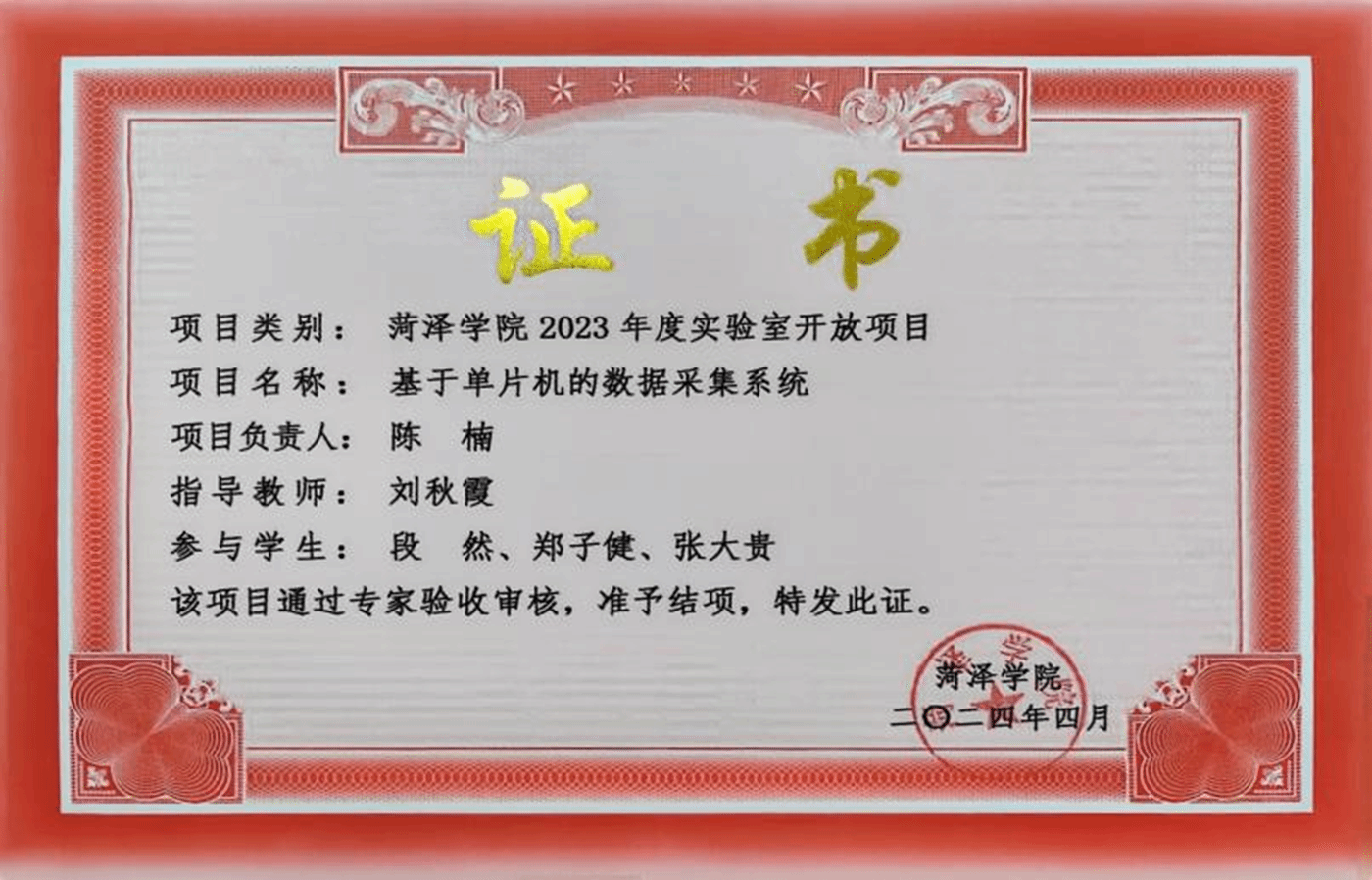 2024年4月,成功申请《基于单片机的数据采集系统》实验开放项目并完成结项。