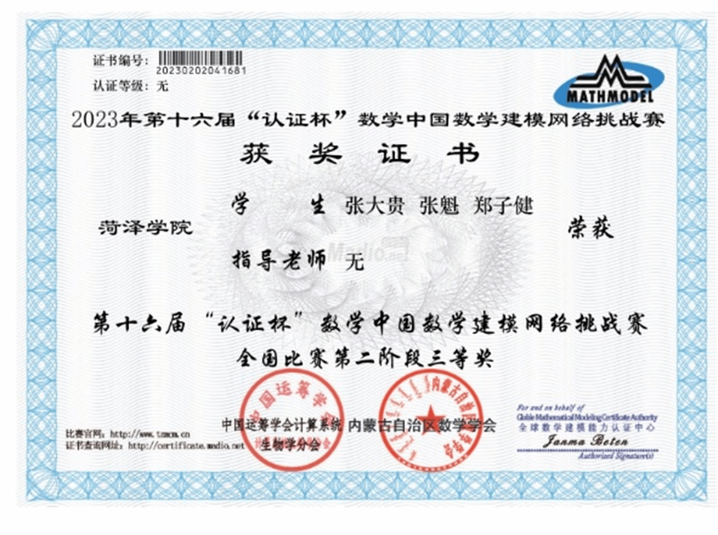 5.2023年12月,获第十六届“认证杯”数学建模网络挑战赛全国比赛第二阶段三等奖。