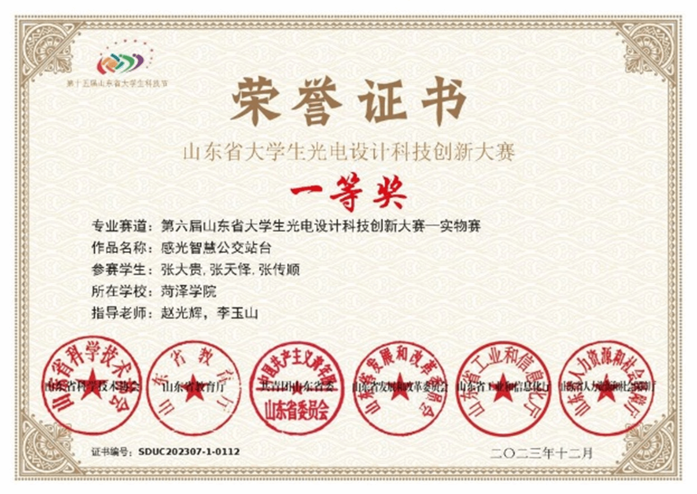3.2023年11月,获第十五届山东省大学生科技节——光电设计科技创新大赛一等奖;