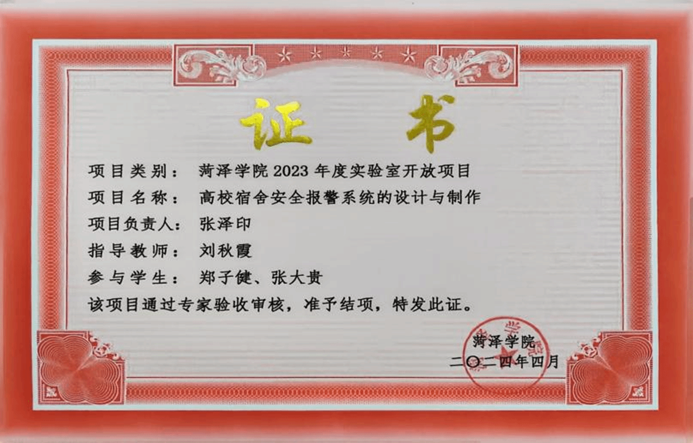 2024年4月,成功申请《高校宿舍安全报警系统的设计与制作》实验开放项目并完成结项。