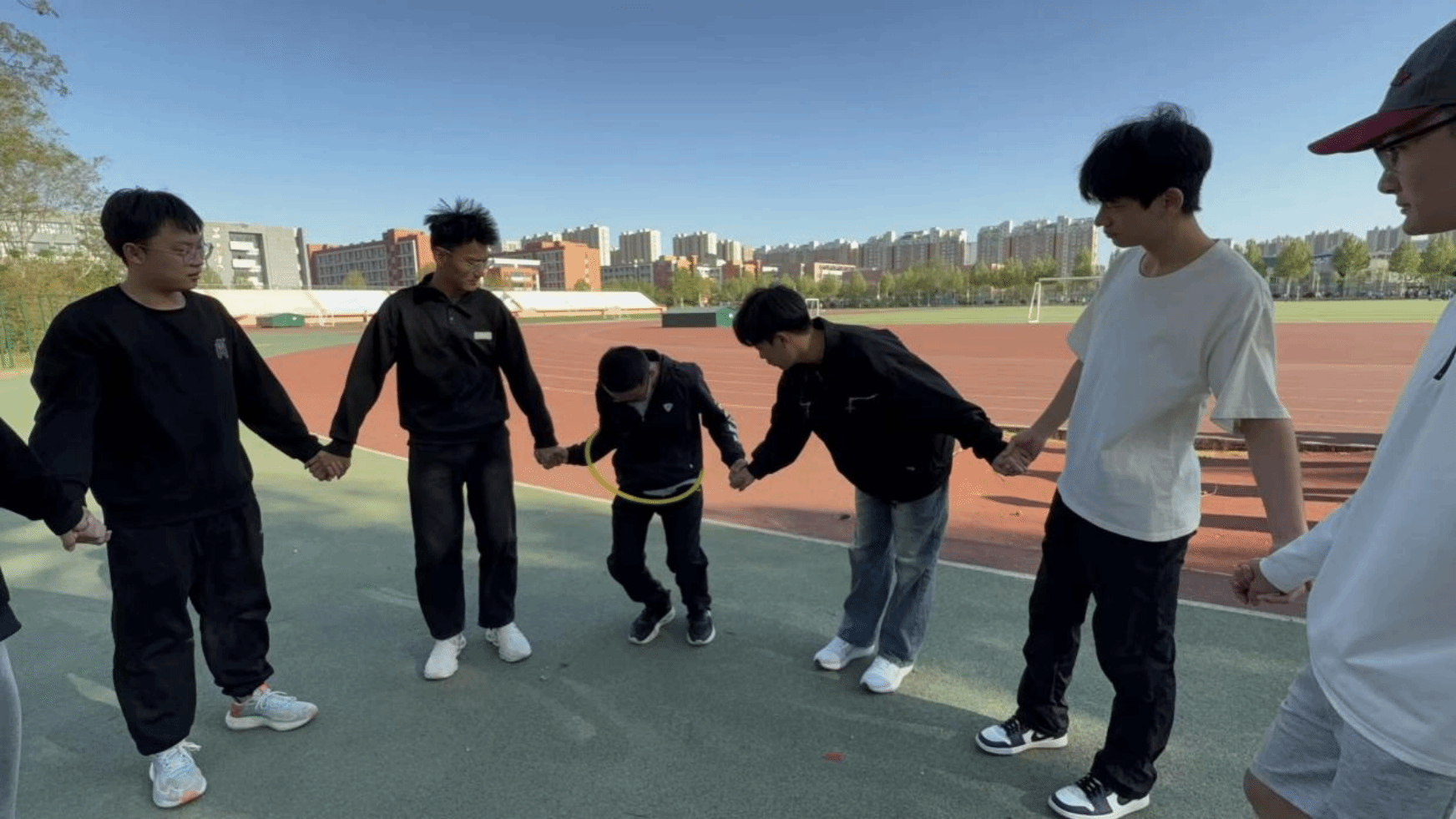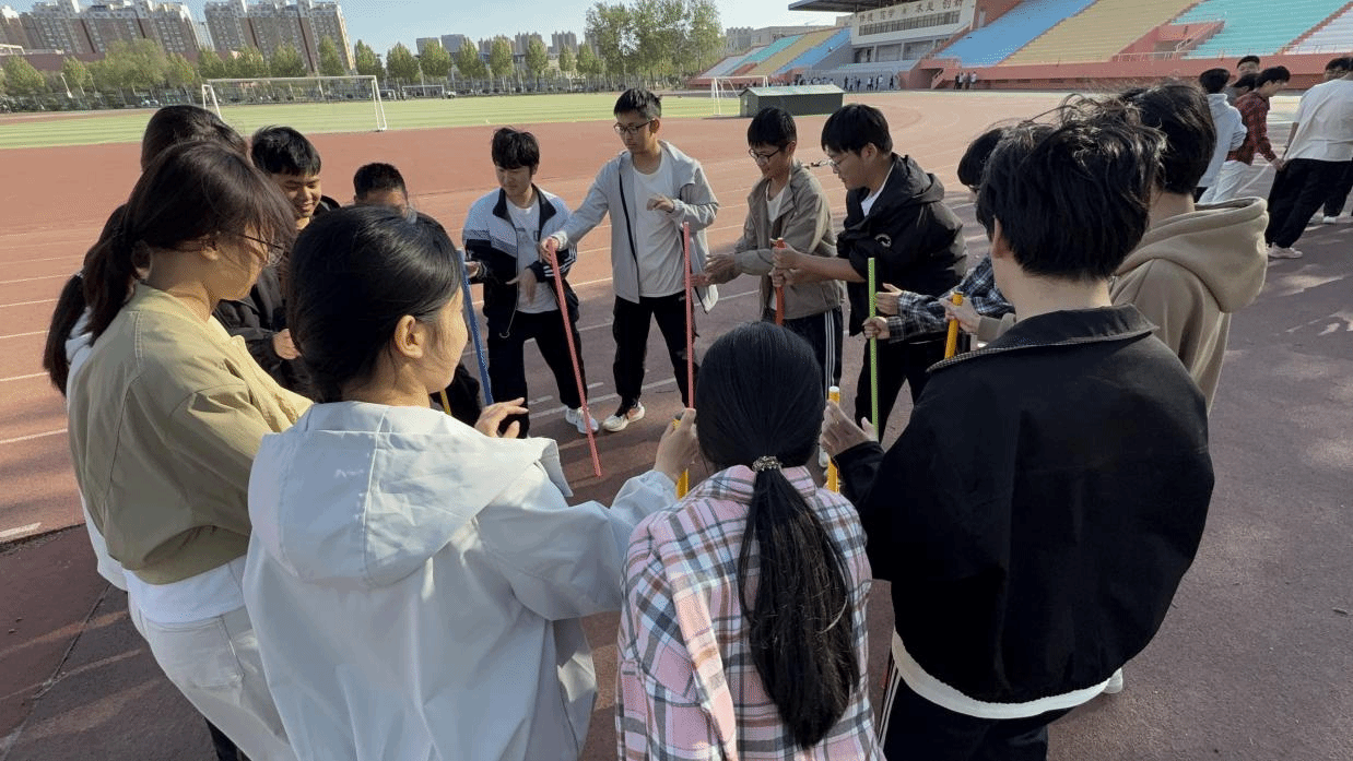 活动伊始,同学们分成两组,一组进行的是“一穿到底”游戏。游戏开始,同学们迅速手拉手,围成一个圈传递圆环,随着不断的尝试,彼此间默契渐生。大家身体灵活地配合着圆环的移动,动作越来越流畅。另一组同学进行的是“不倒森林”游戏。每位同学手持一根塑料棍,围成圆圈。在规定口令下达后,同学们小心翼翼地移动,去接住相邻同学松开的塑料棍。同学们不断调整自己的动作和节奏,配合变得越来越默契。在游戏过程中,同学们深谙游戏之魅力,尽享欢乐时光,更是在潜移默化中不断强化了团队协作精神与集体意识。