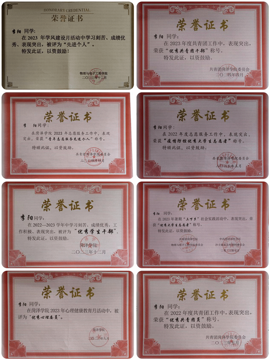 在任职期间,李阳具有较强的组织领导能力和团队协作精神,曾多次获得校级“优秀学生干部”称号、累计获评校园志愿服务活动“优秀志愿者”称号四次。在班级中,对于老师传达的的指令做到具以告之,在规定时间内收齐班级同学的作业和各类实验报告;在校组织和院学生会中,积极组织开展各项团体活动,秉承全心全意为同学服务的宗旨,2022-2024年度累计参与策划组织学生活动30余次,连续两年参加best365手机版官方网站“学生代表大会”和“迎新生”工作,志愿服务时长累计150余小时。
