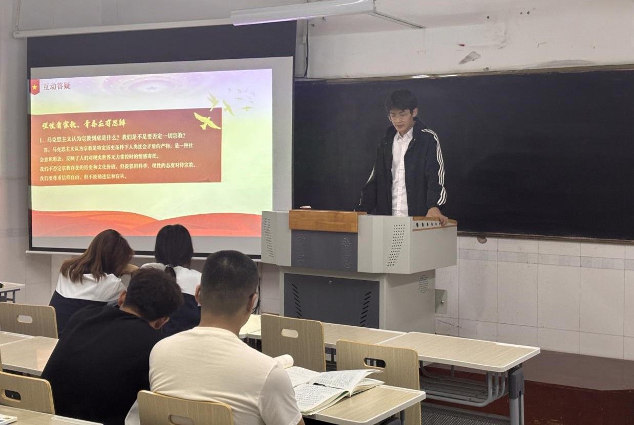 负责演讲的同学从宗教的本质、宗教的社会影响、马克思主义宗教观的核心立场以及看待宗教问题的正确态度等角度切入,系统阐释我国的宗教政策与新时代大学生应秉持的宗教认知。她指出,大学生应坚持唯物史观,既要尊重宗教信仰自由,也要增强对非法宗教活动和邪教组织的警惕性,以理性科学的精神看待宗教问题,坚定马克思主义宗教观。同时她进一步结合现实案例,深入剖析了极端宗教思想对社会稳定的危害,以及正面宗教观在化解矛盾,促进和谐社会的积极作用。