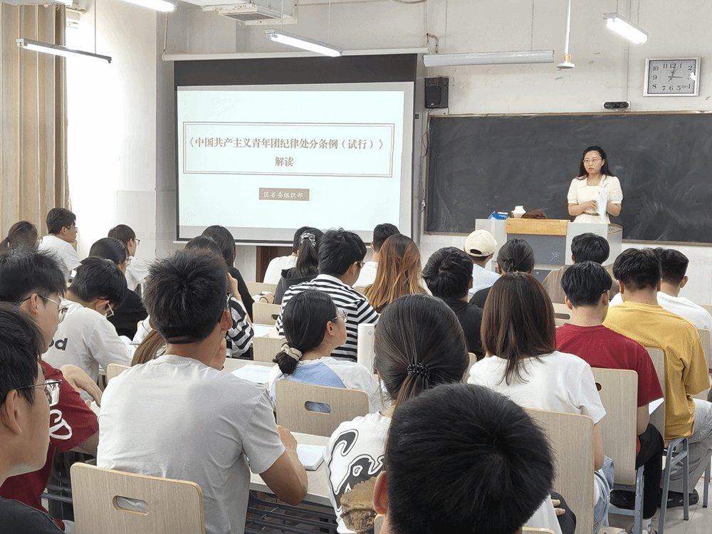 会议中,许莉老师带领同学们围绕《中国共产主义青年团纪律处分条例(试行)》和《中国共产主义青年团纪律处分工作规则(试行)》等重要文件,对总则、团纪处分种类及责任区分、违反纪律行为的处分和团纪处分运用规则等方面进行细致解读,同时结合学生实际学习生活,引用典型案例,深入剖析团员违纪行为的界定及相应处分措施,引导团员青年以《条例》为镜,对照检视自身言行。她提到,共青团作为党的得力助手和后备军,肩负着为党培养优秀青年人才的重任,每一位入团积极分子都应深刻认识到严守纪律的必要性,并要求团干部充分发挥模范带头作用,以青春之我、奋斗之我,为共青团事业高质量发展注入青春力量。
