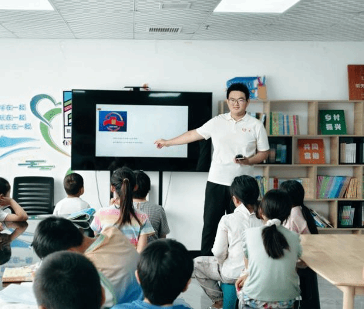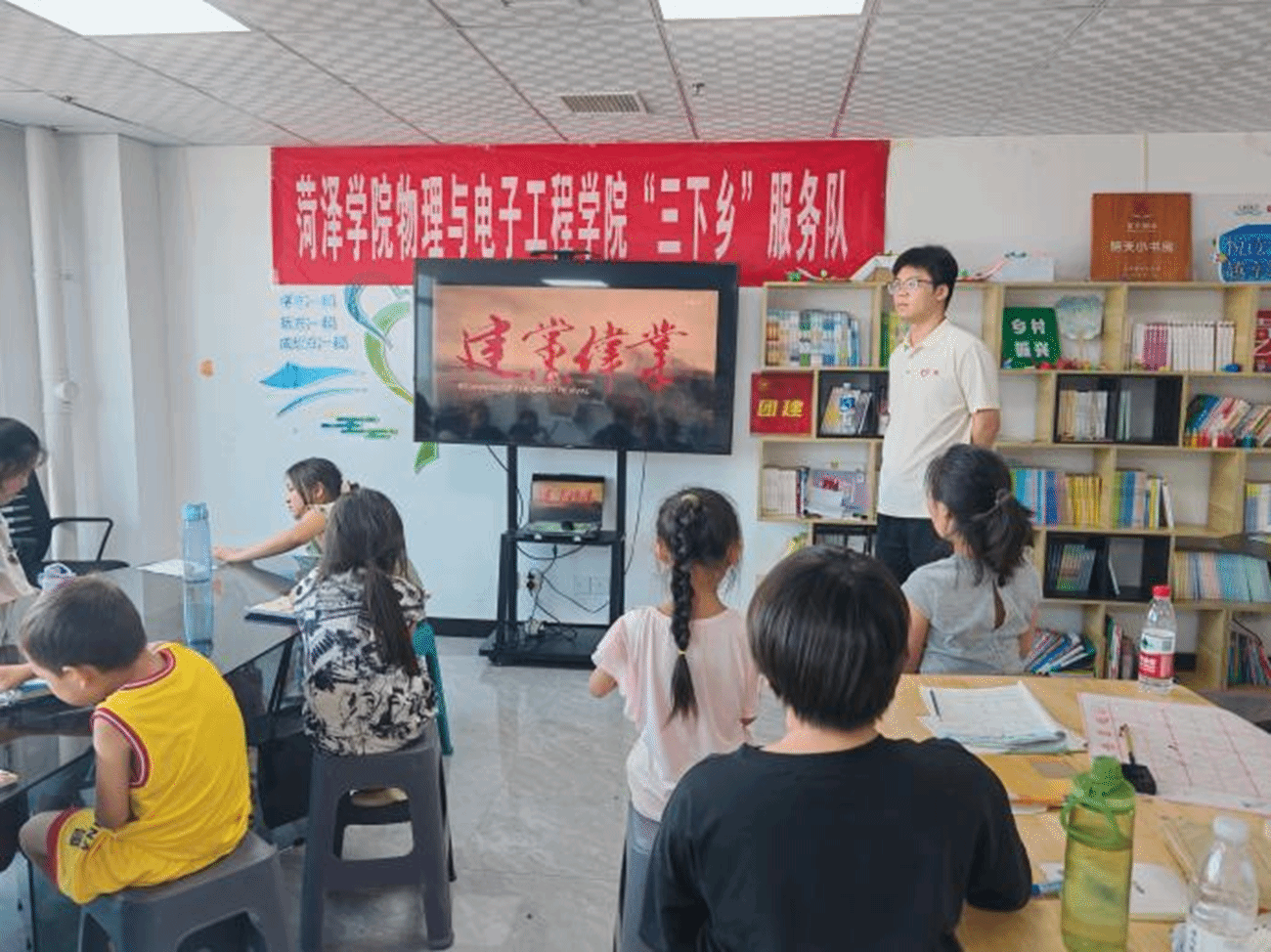 在“小荷学堂”,教育的交响奏响希望乐章:晨光中古诗平仄跌宕,五千年文脉在童声中绵延;科学实验台前,太阳能风车转动好奇之光,三峡大坝模型诠释大国工程;墨香氤氲的书法课上,志愿者的大手紧握小手,写下遒劲的“中国”二字。一个小女孩仰头轻问:“老师,这就是我们的‘根’吗?”稚嫩的叩问激起最深沉的共鸣;当《保卫黄河》的激昂合唱响彻教室,孩子们涨红的小脸和紧握的拳头,让在场的每一位青年志愿者心潮澎湃。