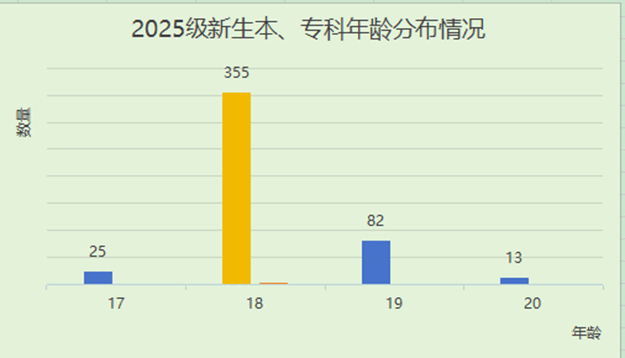 2025级普通本、专科新生年龄分布相对集中,整体以18岁为主体。具体来看,17岁新生共25人,18岁人数最多,达355人,占总体的绝大多数;19岁为82人,20岁新生人数最少,仅13人。从年龄结构可以看出,新生普遍处于18岁这一典型高校入学年龄,整体分布符合正常升学规律。最小年龄17岁,出生于2008年3月12日;最大年龄20岁,出生于2005年1月18日,两者相差三岁,反应出个别学生因入学时间或学制差异等因素导致的年龄稍早或稍晚现象,但仍处于正常高等教育入学年龄区间内。