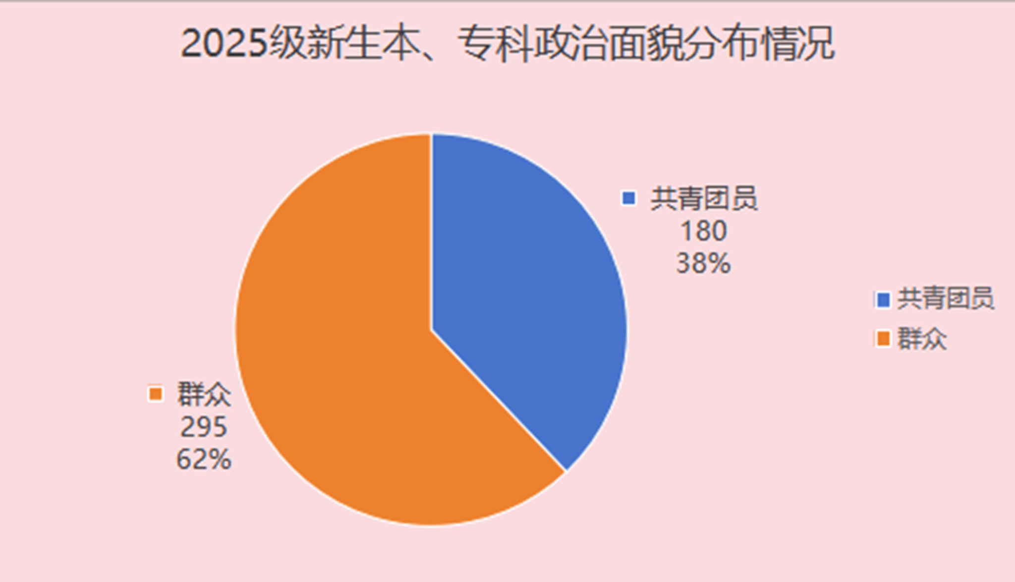 由图可知,群众身份的学生共有295人,共青团员为180人。从比例上看,群众占比约62.11%,共青团员占比约37.89%。学院共青团组织将在今后工作中积极发挥思想引领作用,吸引更多青年学生向组织靠拢,为进一步培养和发展党员奠定基础。