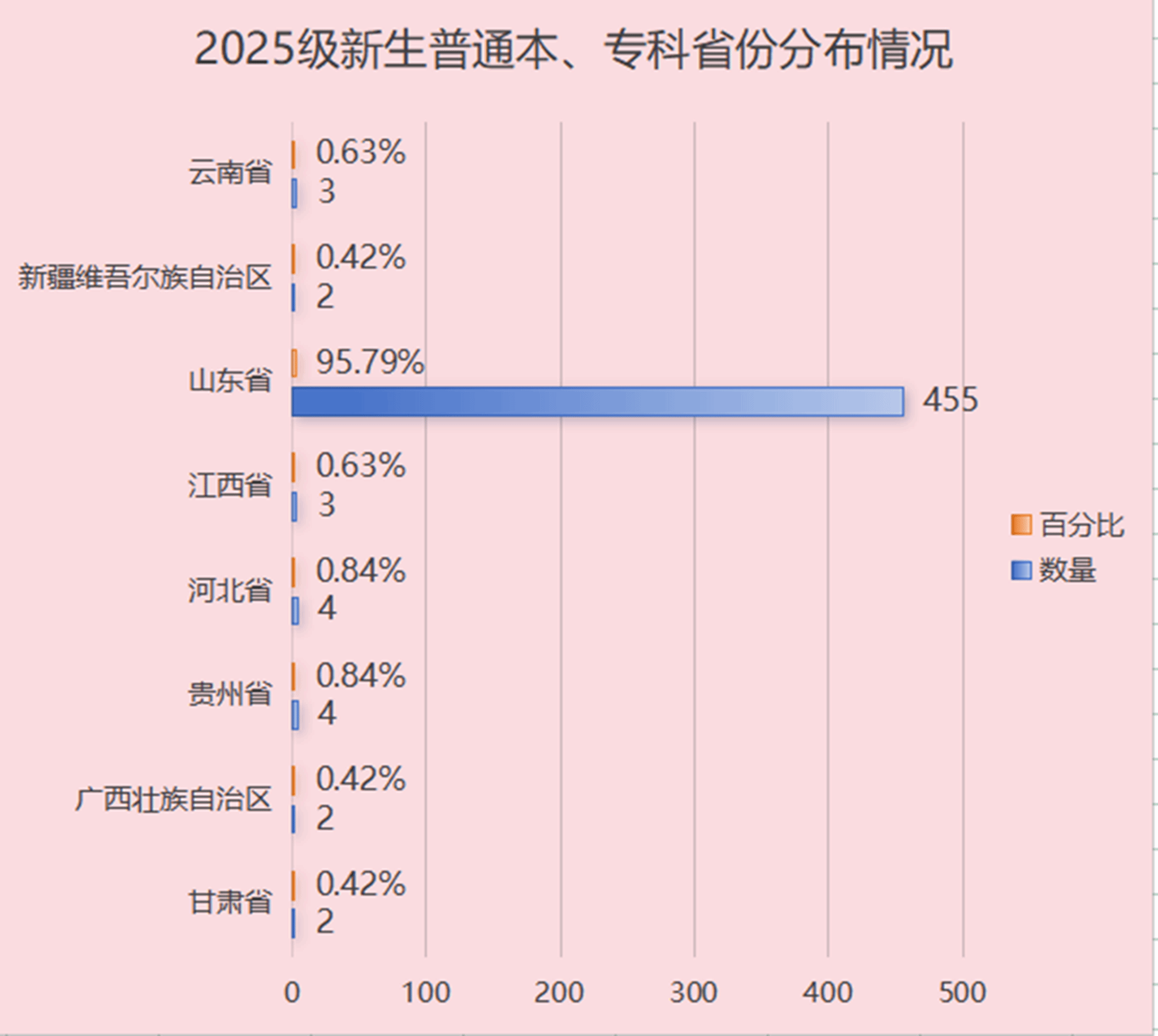 best365官网2025级普通本、专科新生生源覆盖多个省份,其中山东省生源共计455人,占总人数的95.79%,占据绝对主体;其余来自其他省份的新生占比为4.21%,共同构成了多元的地域结构。