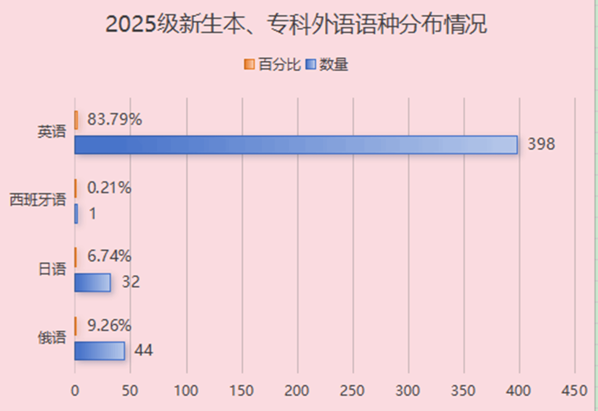 2025级本、专科新生外语语种选择呈现明显差异,英语仍占据绝对主流。具体来看,学习英语的学生共398人,占总人数的83.79%;学习俄语的有44人,占比9.26%;学习日语的有32人,占比6.74%;另有1人选择学习西班牙语,占比0.21%。从语种分布来看,绝大多数新生仍以英语作为第一外语,反映出其在基础教育阶段和升学考试中的主导地位。整体而言,外语学习分布呈现出“英语主导、多语并存”的格局。
