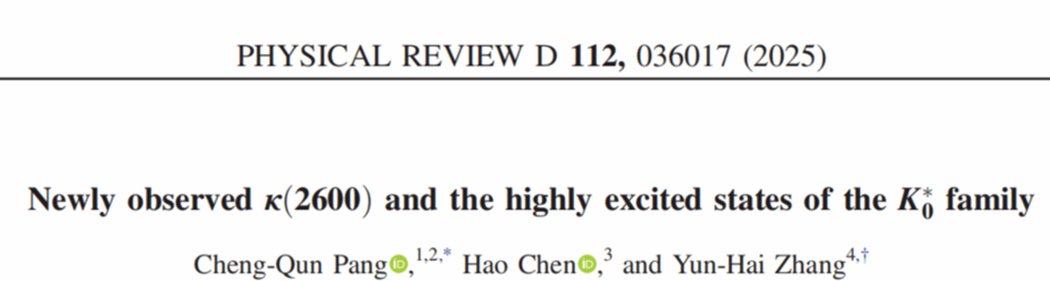 近日,我校best365手机版官方网站张运海教授及其合作研究团队在国际著名期刊《Physical Review D》上正式发表题为《Newly observed κ(2600) and the highly excited states of the K₀* family》的研究成果。