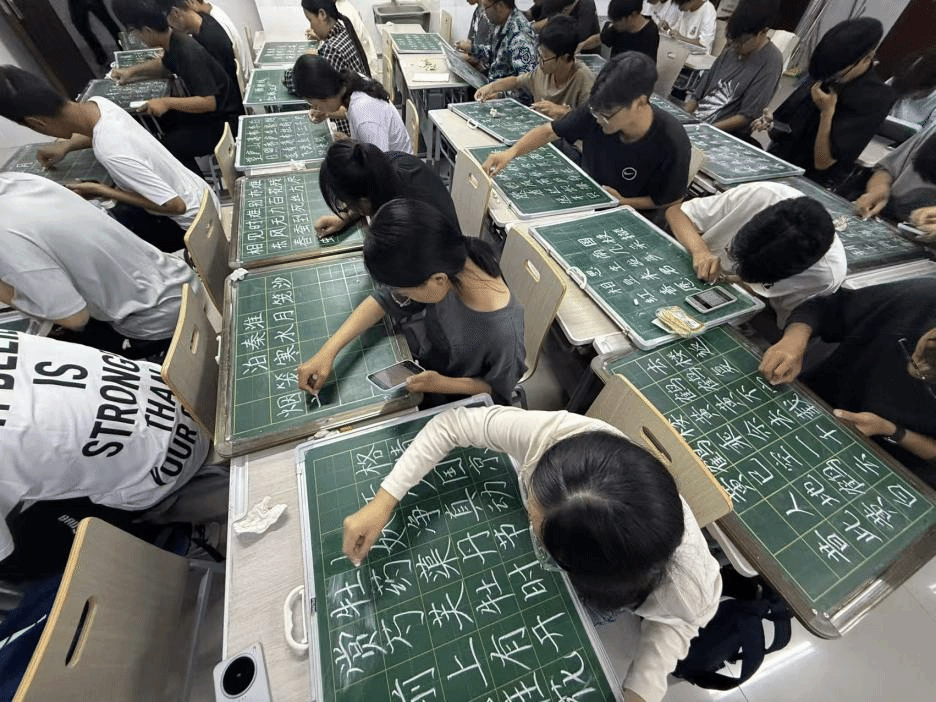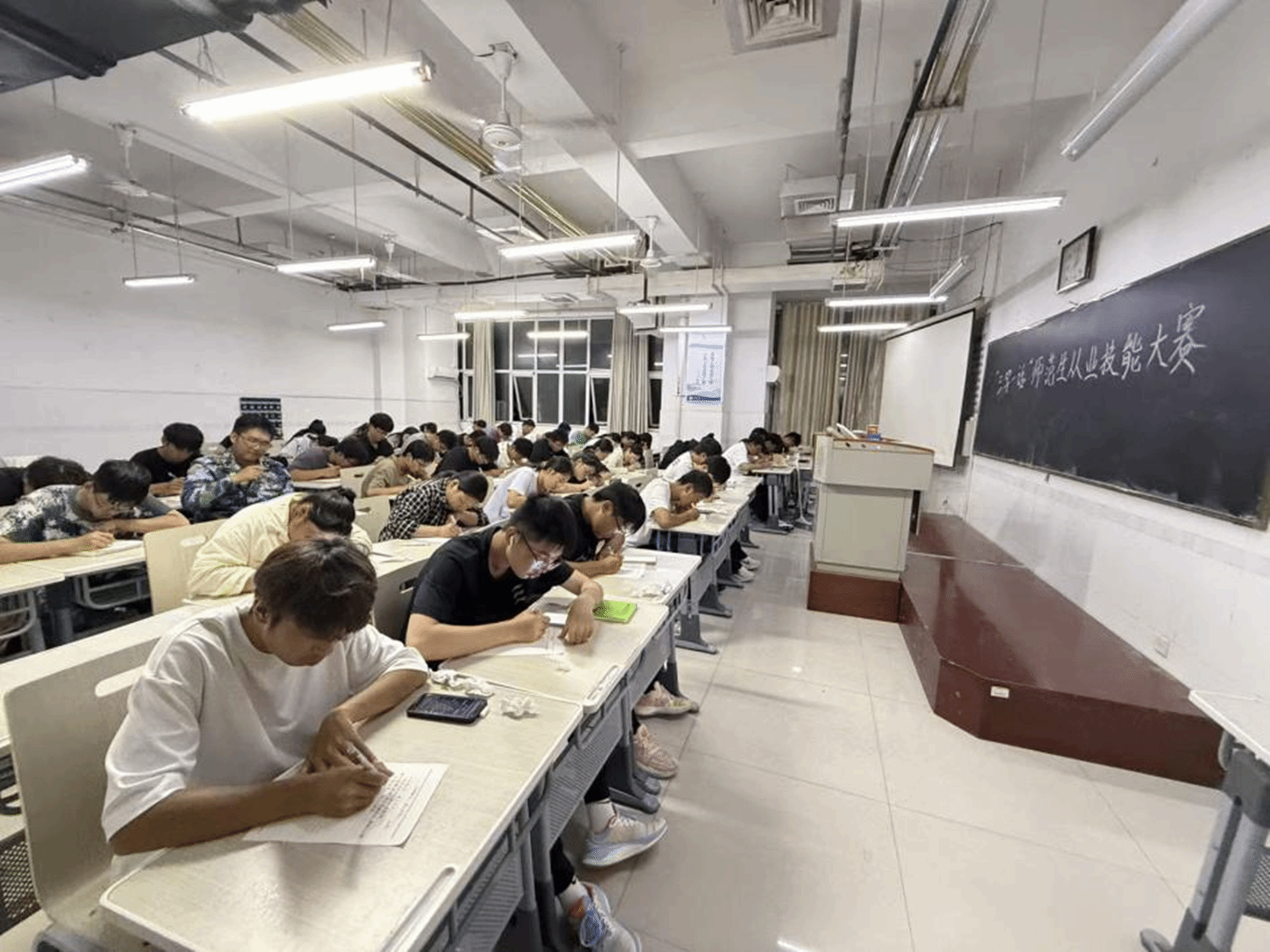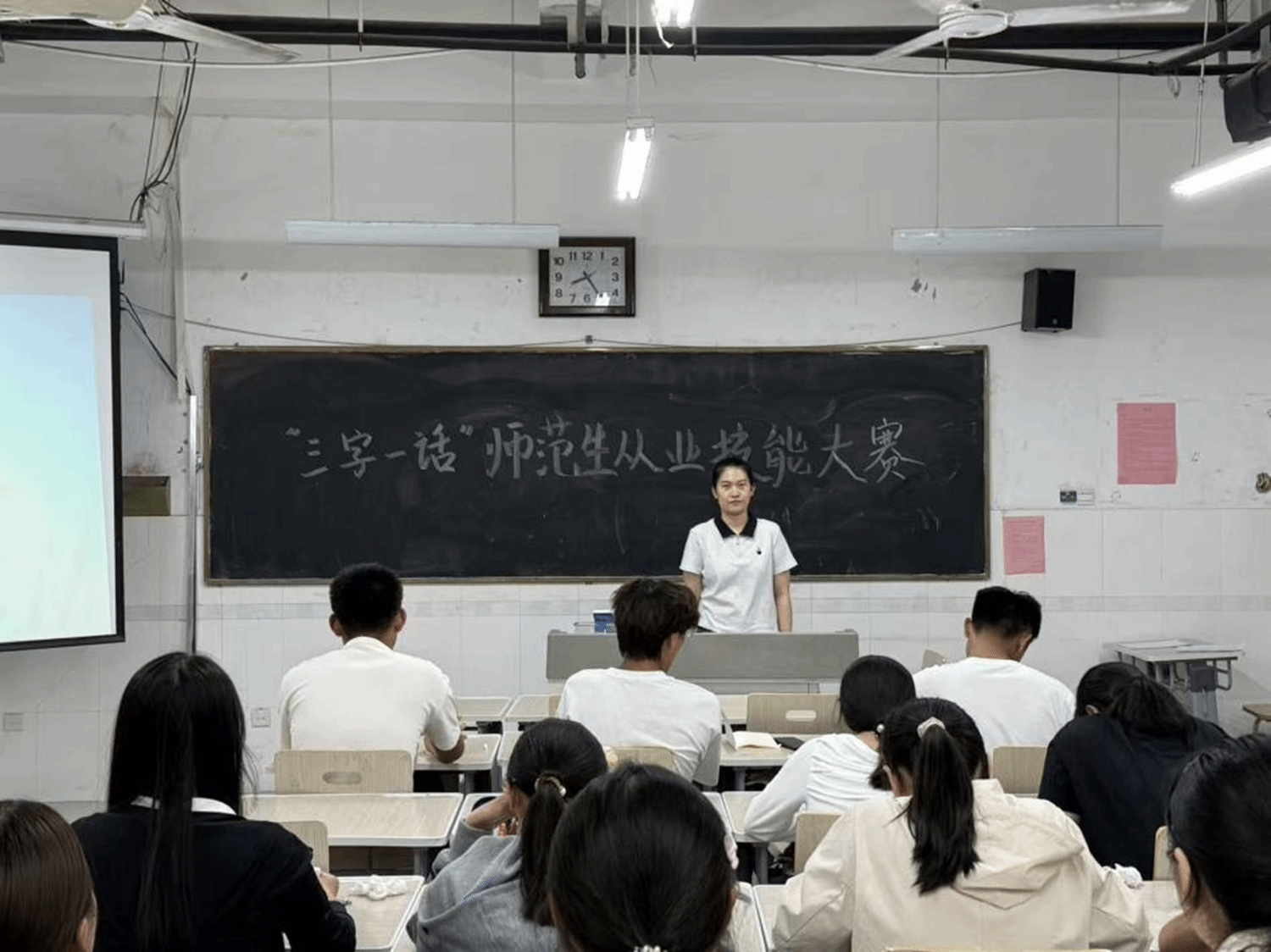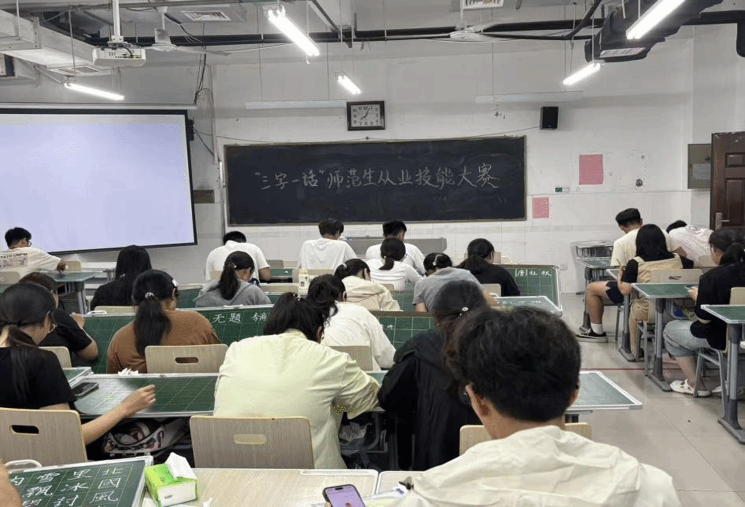 本次比赛不设单项,所有参赛选手须完成钢笔字、粉笔字、毛笔字和普通话四个环节。在钢笔字书写环节中,选手们用心书写与崇教敬学相关的短文,字体工整美观,展现出扎实的书法功底;在粉笔字环节,参赛选手在小黑板上精心布局,运笔自如,一笔一画规范清晰,充分体现出师范生良好的教学板书能力。在毛笔字书写中,参赛者们挥毫泼墨,楷书端庄、行书潇洒、隶书典雅,书香墨韵尽显师范生的艺术素养;在普通话比赛中,选手们发音标准,吐字清晰,语调自然流畅,用优美的声音和真挚的情感诠释着语言文字的魅力,展示了良好的语言素养和积极向上的精神风貌。