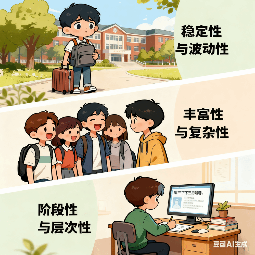 2.丰富性和复杂性并存:情绪体验及其丰富,有自我、学习、社会体验;表现形式复杂,有外显性、封闭性、冲动与克制并存等形式。