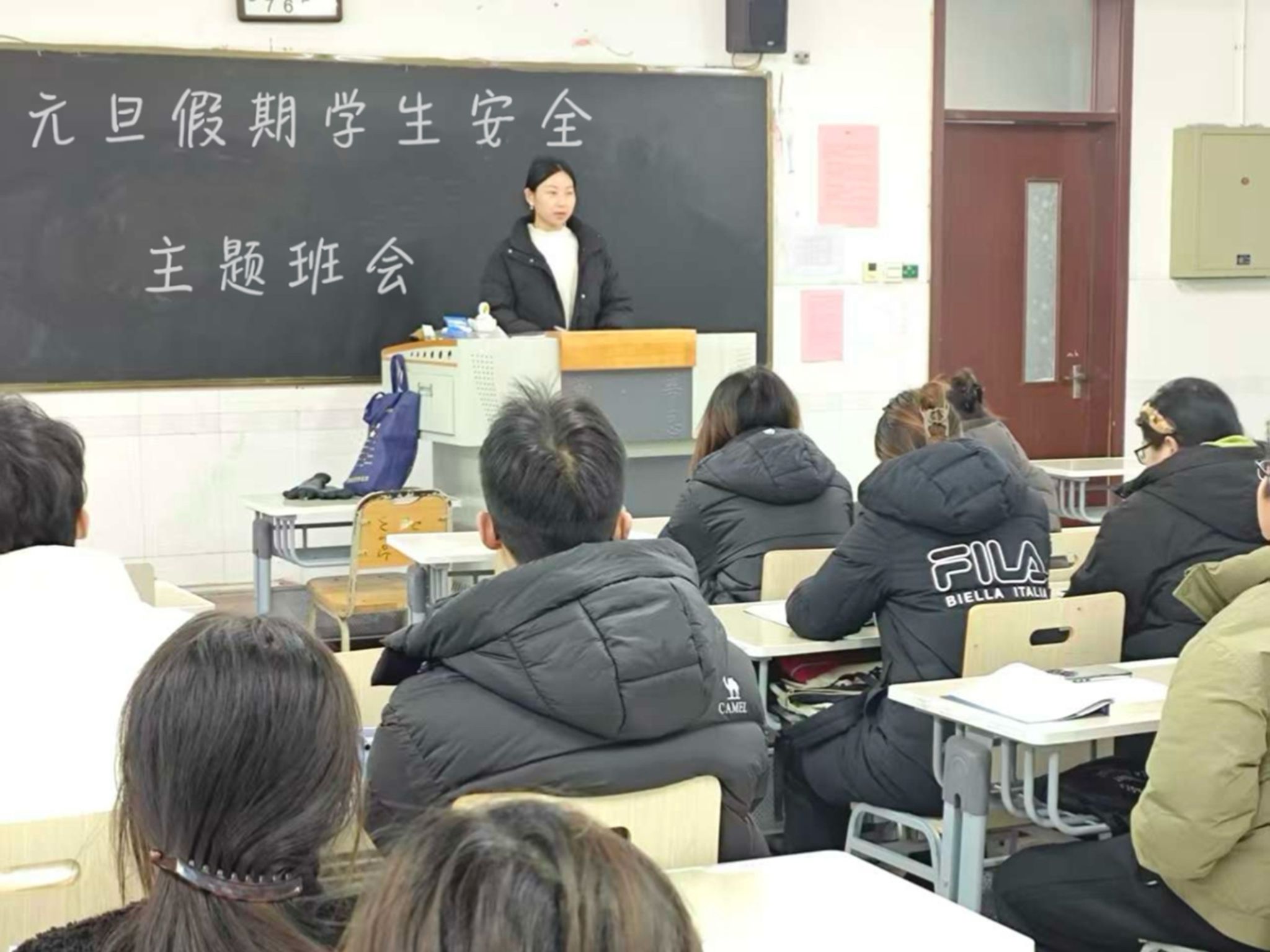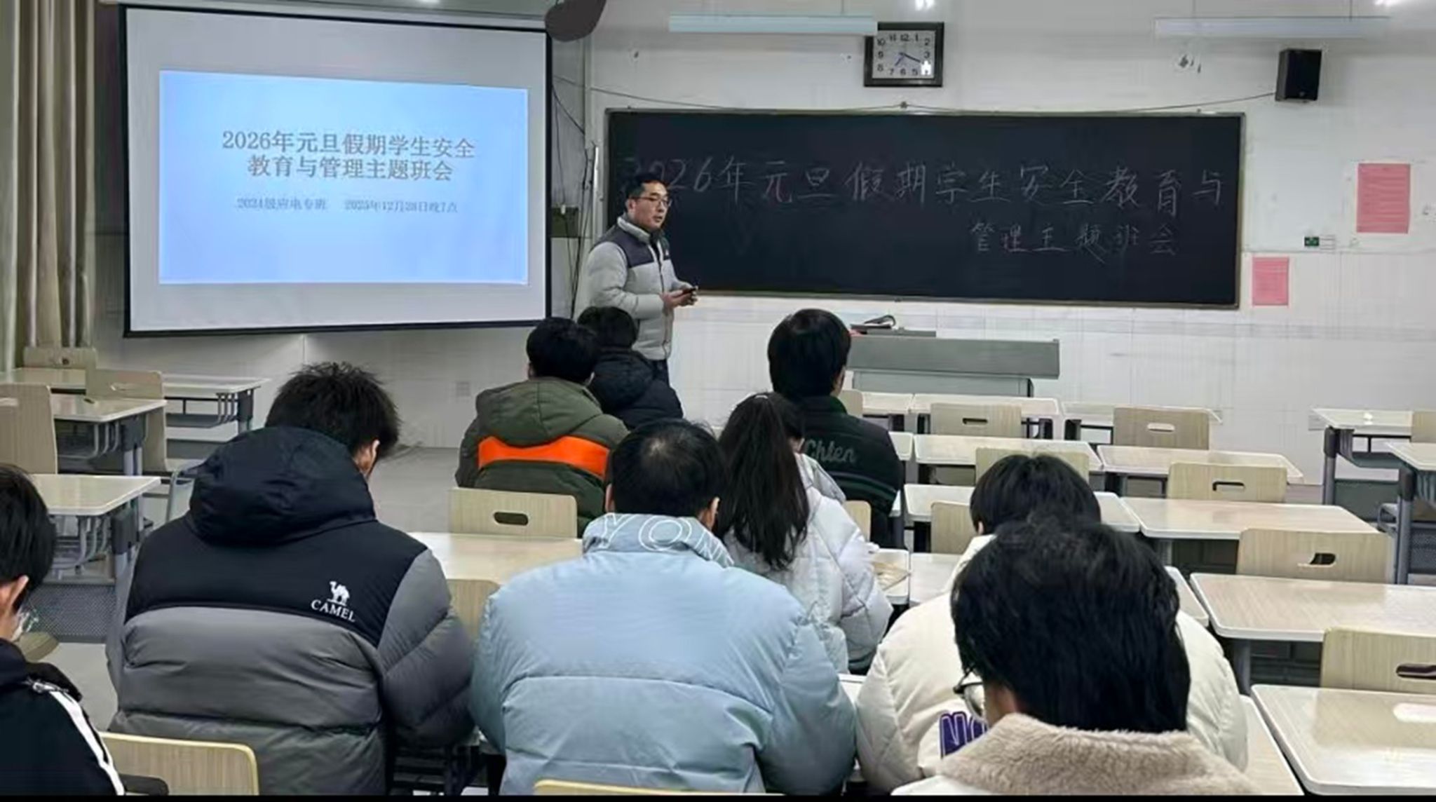班会上,班主任们传达了元旦放假通知与相关要求,重点强调了假期期间的安全注意事项,包括出行交通、宿舍用电、网络安全与财产安全等,提醒同学们时刻绷紧安全弦,提高防范意识。同时,对假期住宿事宜进行了说明,强调留校期间须严格遵守宿舍管理规定,自觉维护宿舍安全与秩序。此外,班会还关注同学们的假期规划,鼓励大家平衡好休息与自我提升,保持规律作息和体育锻炼的习惯,让元旦假期成为放松身心、积蓄力量的美好时光。最后,班会明确了返校时间及相关要求,叮嘱同学们合理规划行程,确保平安返校。
