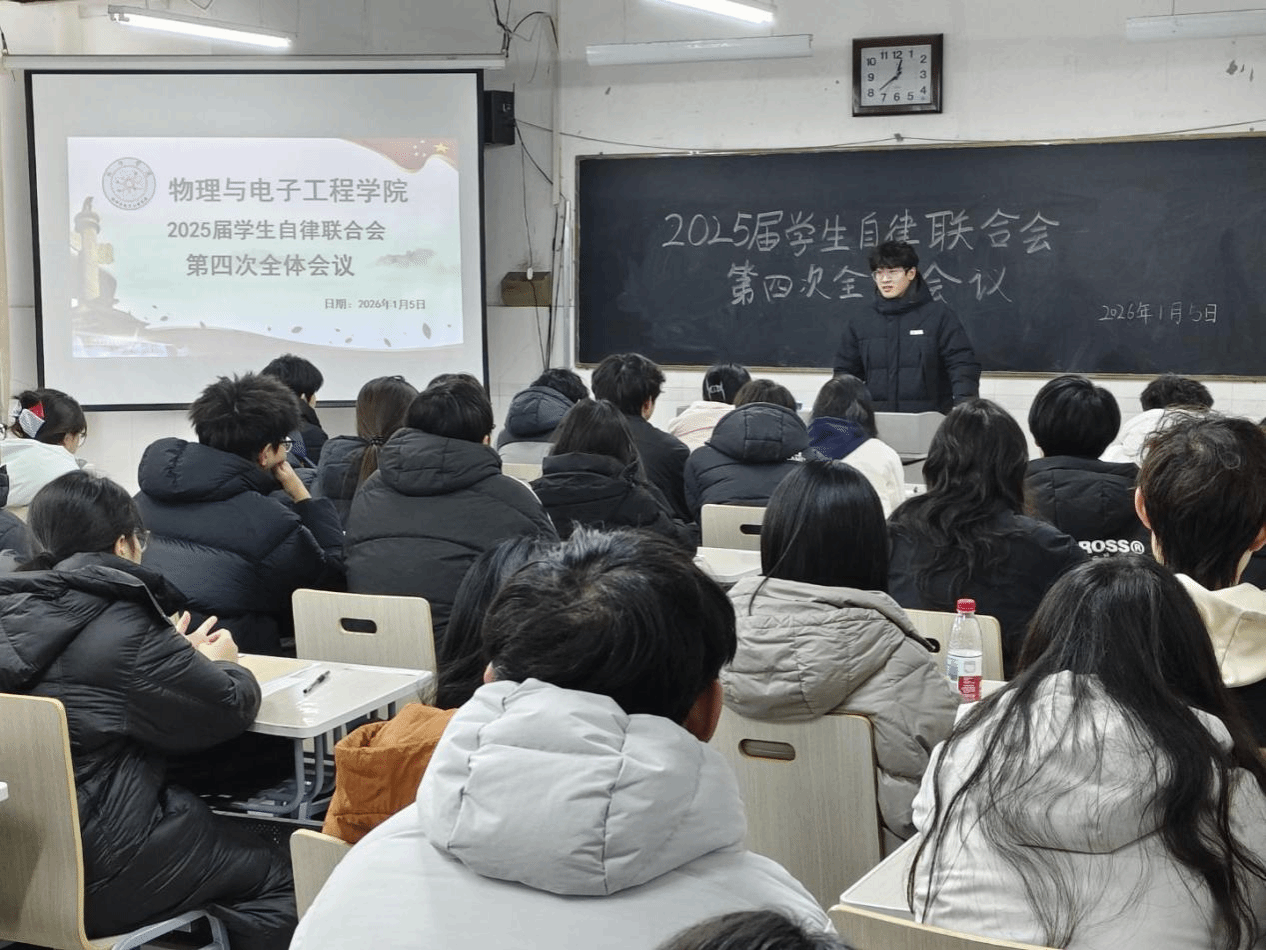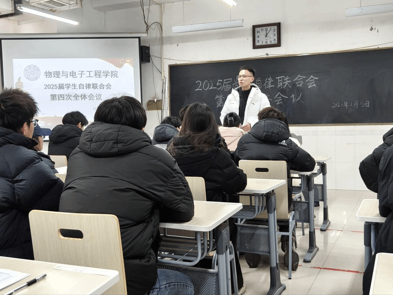 为总结本学期各部门工作成果,并保障期末考试平稳有序进行,1月5日,best365手机版官方网站在综合实验楼W502教室召开2025届学生自律联合会第四次全体会议。此次会议由2025届学生自律联合会秘书长王彦琳主持,辅导员李晨老师及全体学生会成员参会。