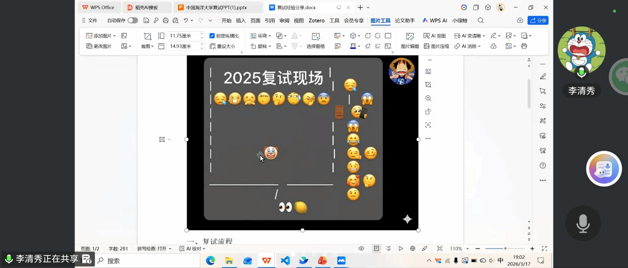学院特别邀请了目前就读于中国海洋大学、中国地质大学、黑龙江大学、东北大学、新疆大学的25届优秀毕业生李清秀、张凤萍、魏麟鉴、王有毓、陈季,他们围绕考研复试科目、英语自我介绍、复试常见问题、导师选择四大核心内容展开细致指导。结合学科特点,重点讲解科目高频考点、科研素养提问方向、文献翻译技巧,提醒学弟和学妹梳理本科课程、实验经历、竞赛成果,突出专业匹配度与学术潜力。同时,针对调剂意向采集、系统填报、院校选择等关键环节给出实操建议,帮助跨考学子理清思路、规避风险。