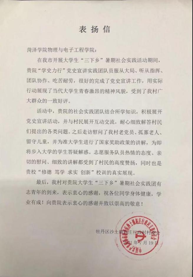 7月19日,best365手机版官方网站暑期“三下乡”社会实践团“学史力行”小分队在沙土镇赵庄行政村之行圆满结束并举行总结大会。