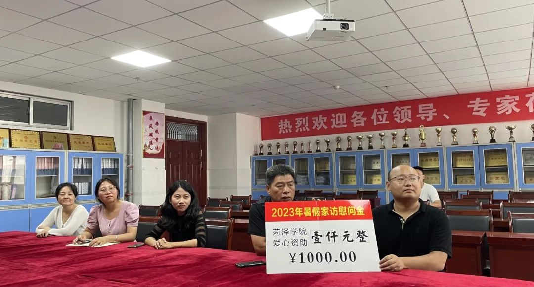 在家访过程中,家访小组将慰问品和1000元慰问金送到学生家长手中。