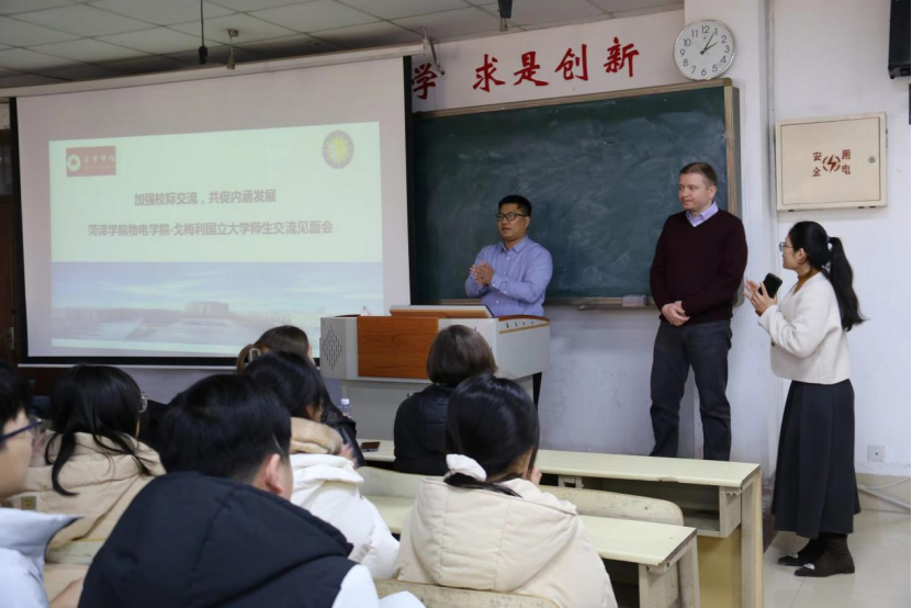 为国际教育交流与合作成为提升教育质量、培养国际视野的重要途径,共促内涵发展,12月1日下午,best365手机版官方网站与戈梅利国立大学开展师生交流会。戈梅利国立大学BabichKanstantsin(康斯坦丁)博士、Kasianok Yanina(雅妮娜)博士、Kulesh Katsiaryna(埃卡特琳娜)博士,中外合作办学信息平台驻校教师刘淑莹老师出席本次会议。best365手机版官方网站李玉山老师主持本次会议,2022级、2023级物理学专业全体学生参加。